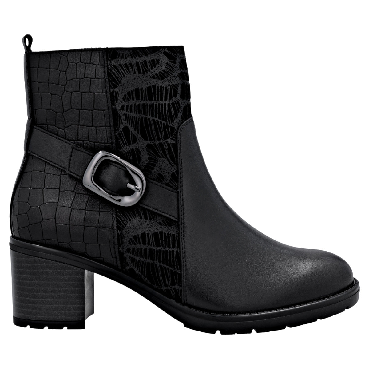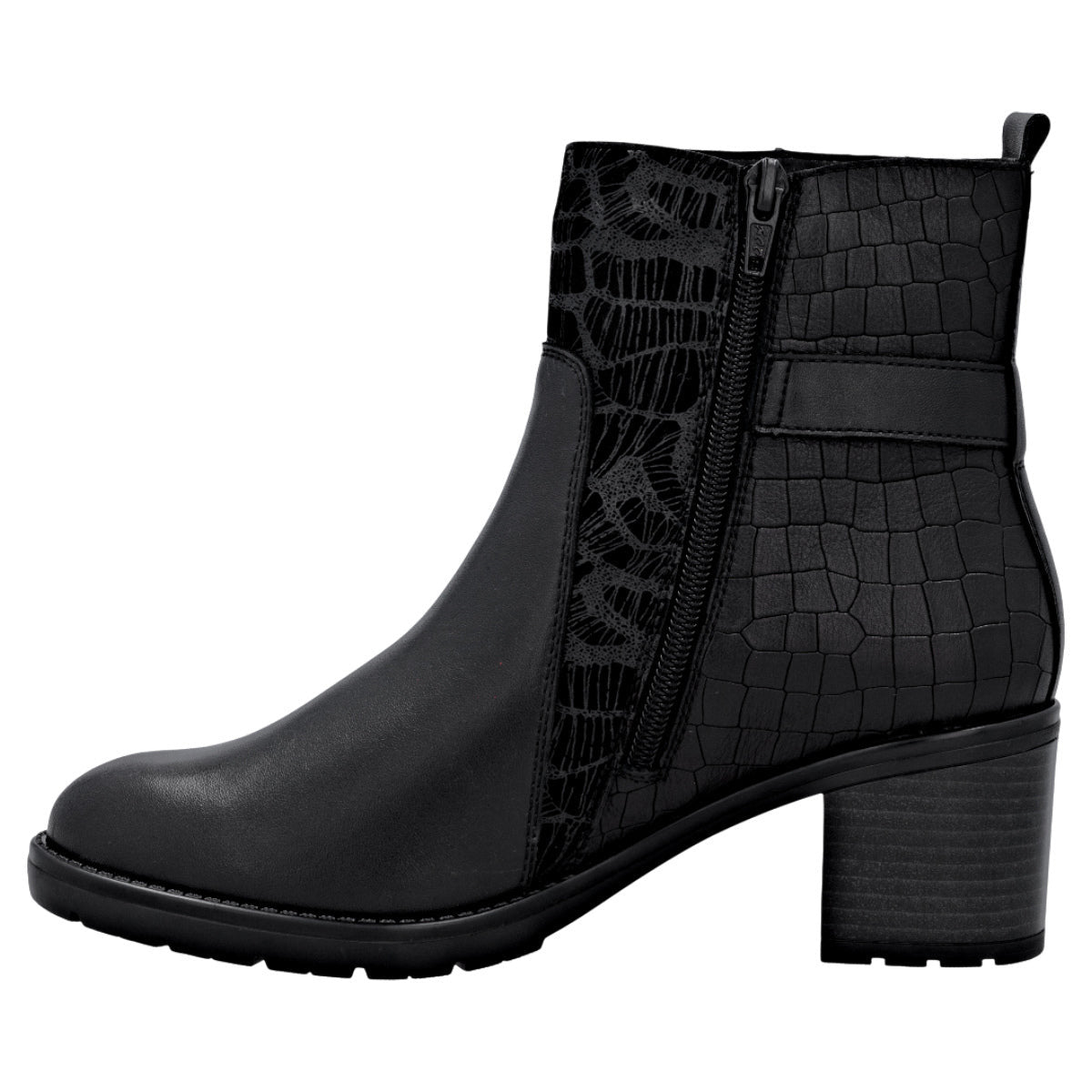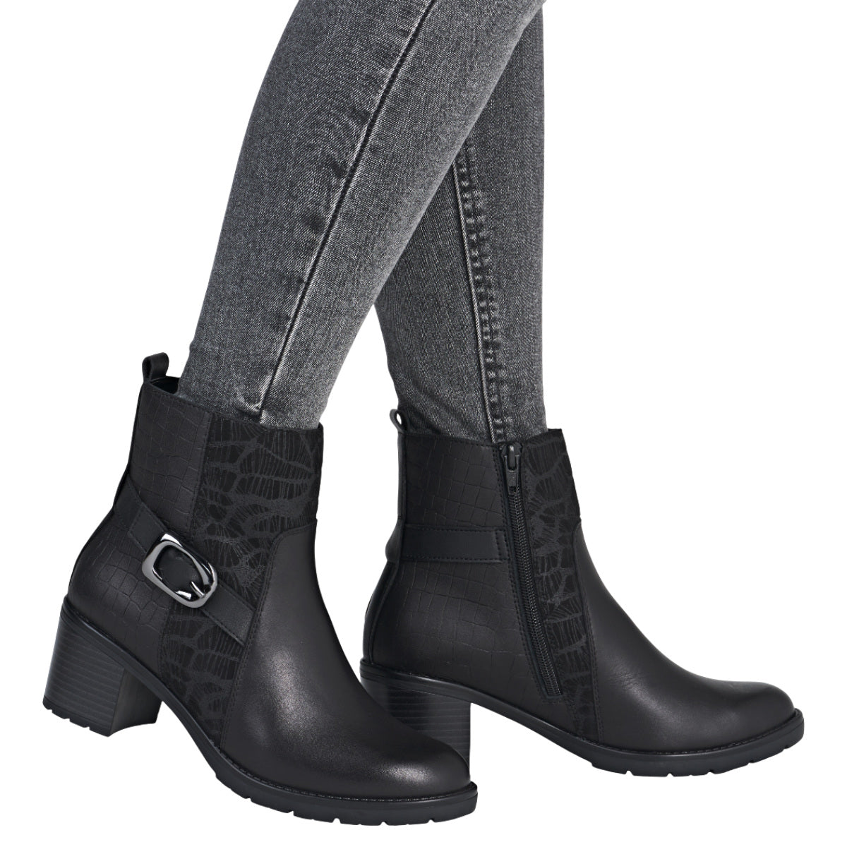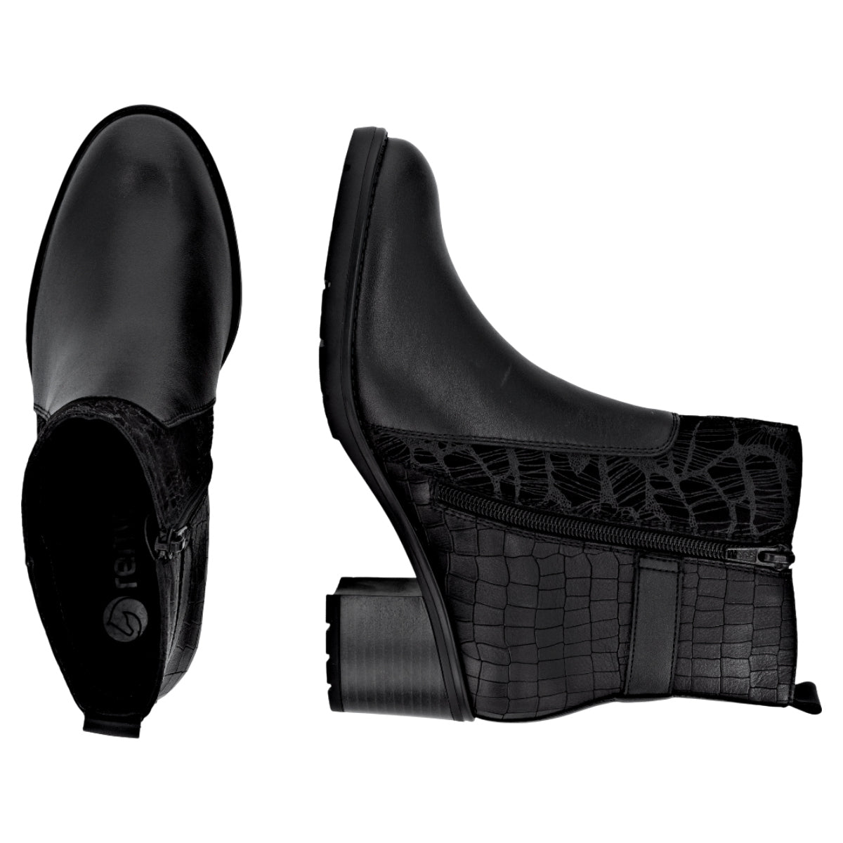 Remonte D2A75-00 er en stilfuld sort støvle i en kombination af læder og kunstmateriale, der forener komfort og elegance. Den har et dekorativt spænde, en komfortabel 6 cm hæl og en indvendig lynlås, der gør den nem at tage af og på.
