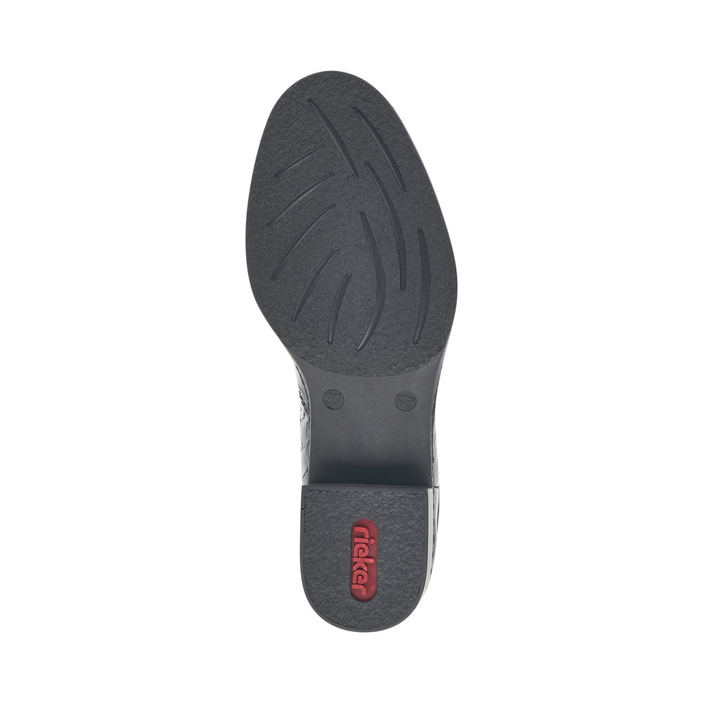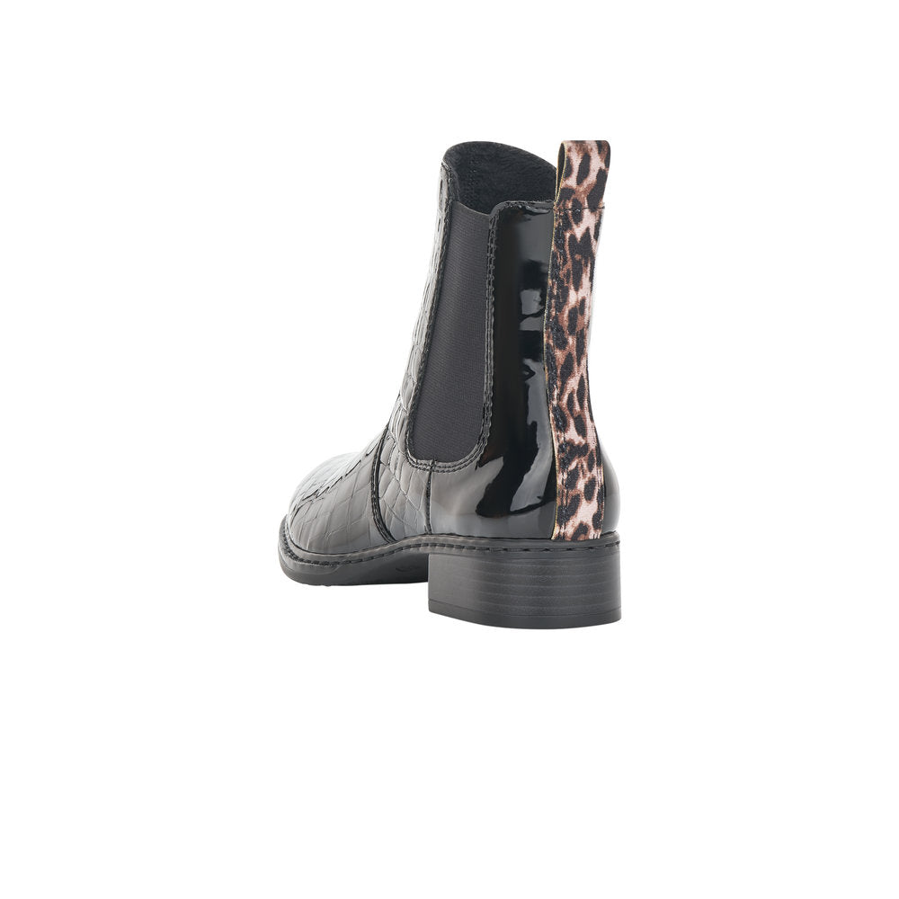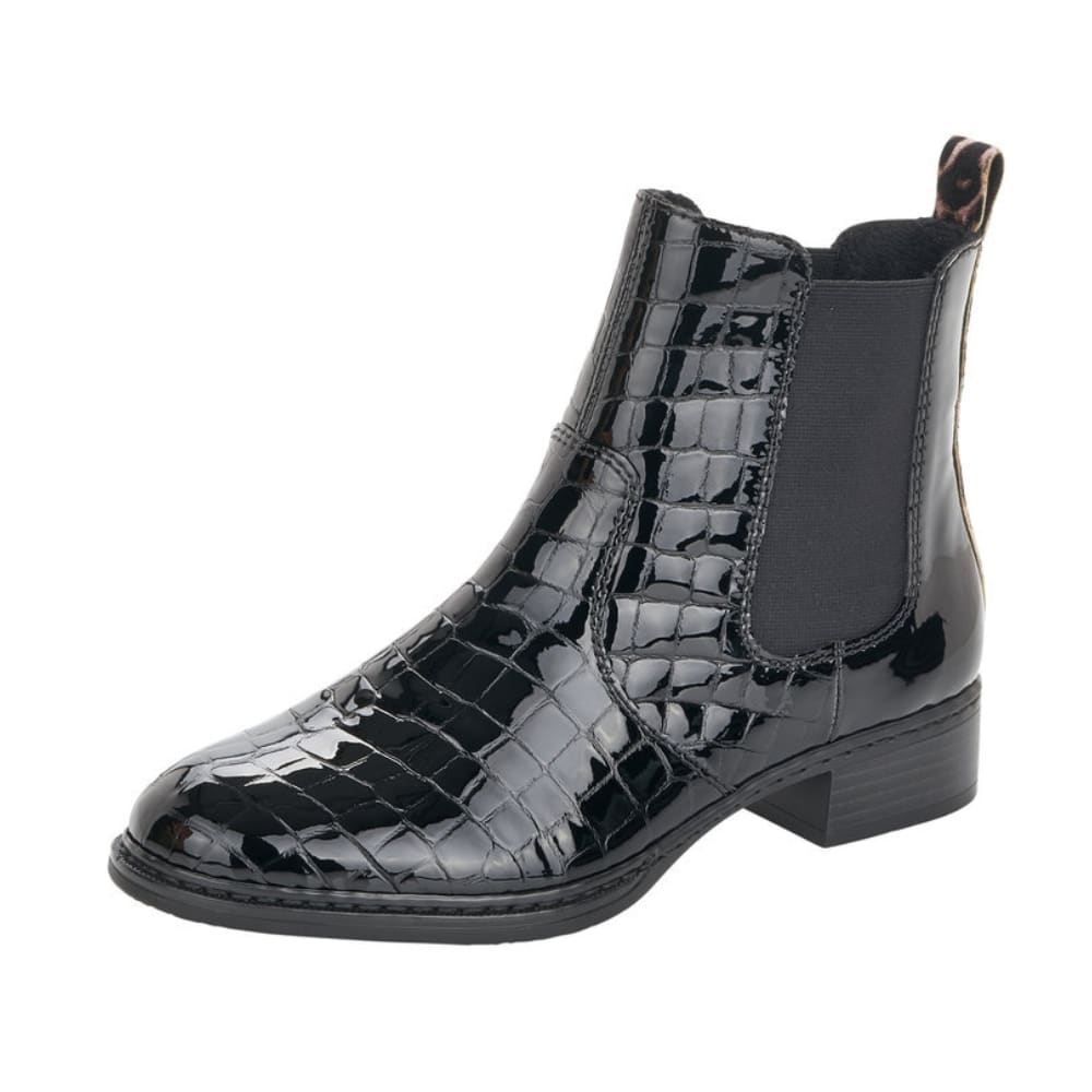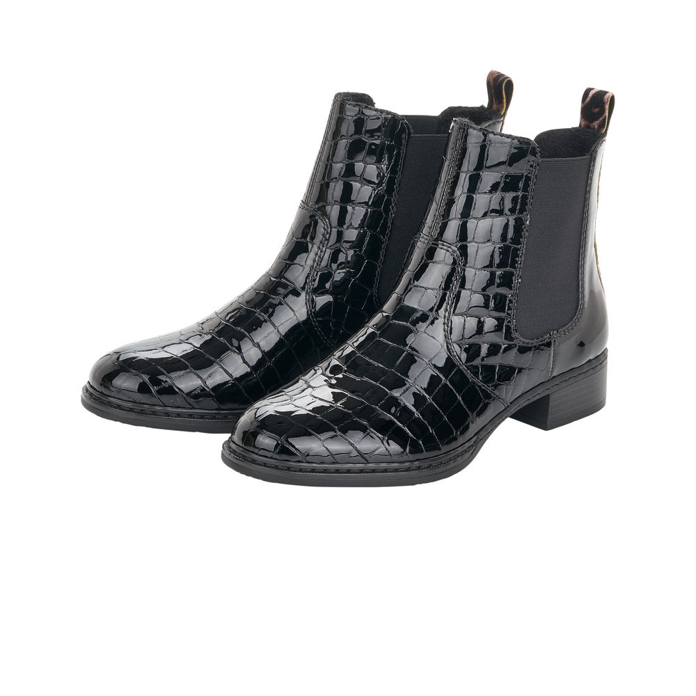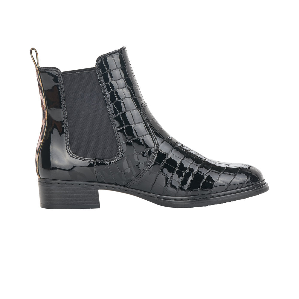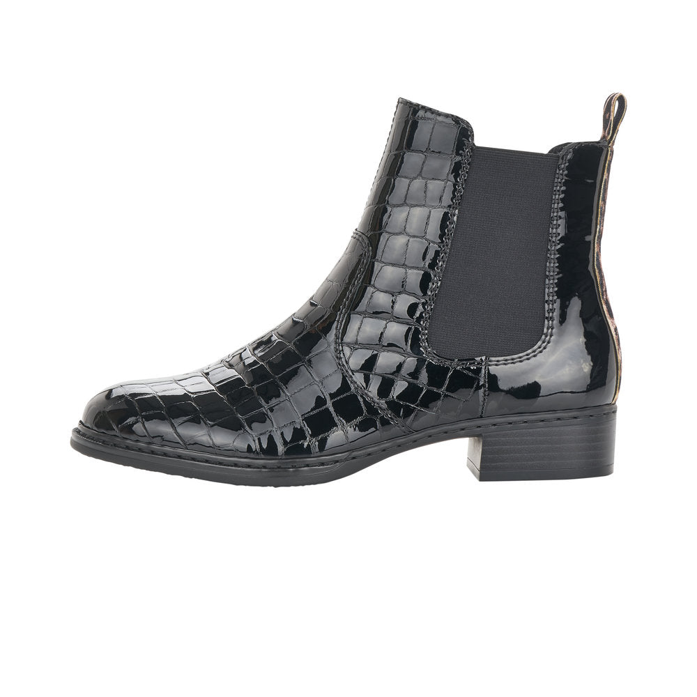 Rieker støvle til dame i sort lak. Denne stilfulde Rieker støvle i sort lak kombinerer fleksibilitet og komfort med et elegant look. Den klassiske chelsea støvle har elastik i begge sider, så du nemt kan tage den af og på, samtidig med at pasformen bliver god og fleksibel. Indvendigt er støvlen let foret og har en blød sål, der giver en behagelig oplevelse hele dagen. Den lille hæl på 3 cm. giver et elegant løft, mens den solide ydersål med stødabsorbering sikrer støtte og skridsikkerhed.