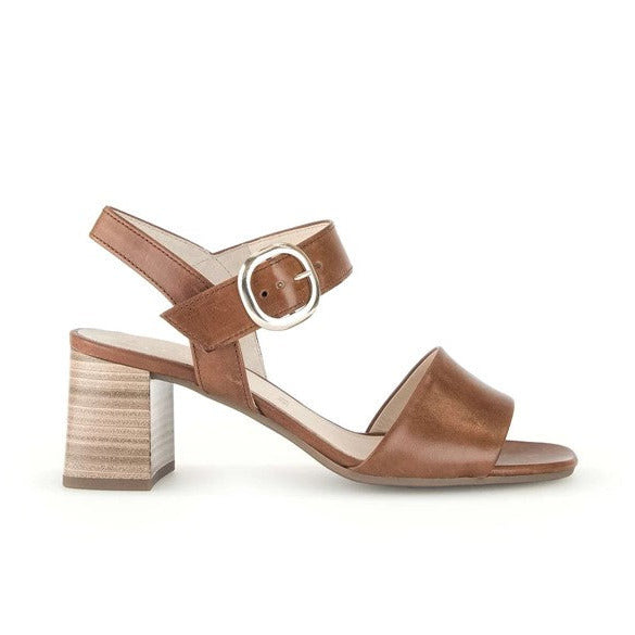 Brun skind sandal med rem over vristen og pynte guldspænde. Lukning med velcro. Normal vidde F + Best Fitting for ekstra plads i forfoden. Let gummisål og 5 cm høj hæl.