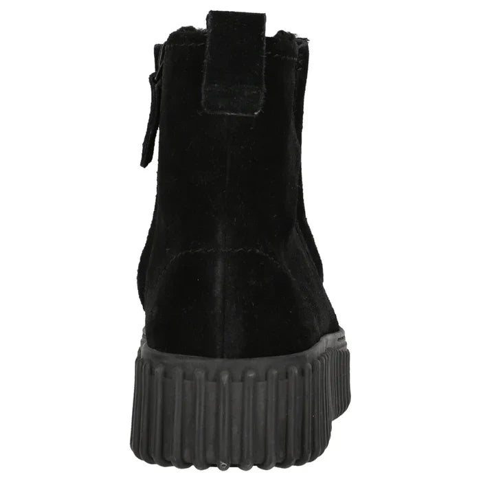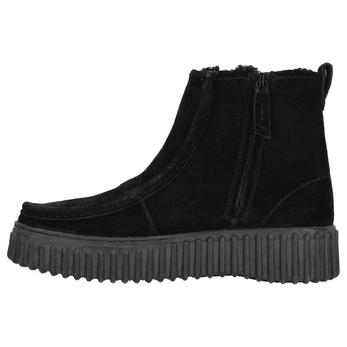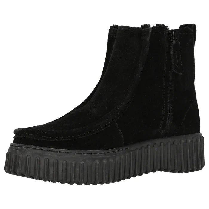 Torhill Cozy fra Clarks forener luksuriøs komfort med moderne retrostil. Støvlen er fremstillet i blødt sort ruskind og foret med varm faux fur, der giver en hyggelig og eksklusiv fornemmelse på kølige dage. Den indvendige lynlås sikrer nem af- og påtagning, mens den formstøbte Contour Cushion™ fodseng giver blød støtte hele dagen.