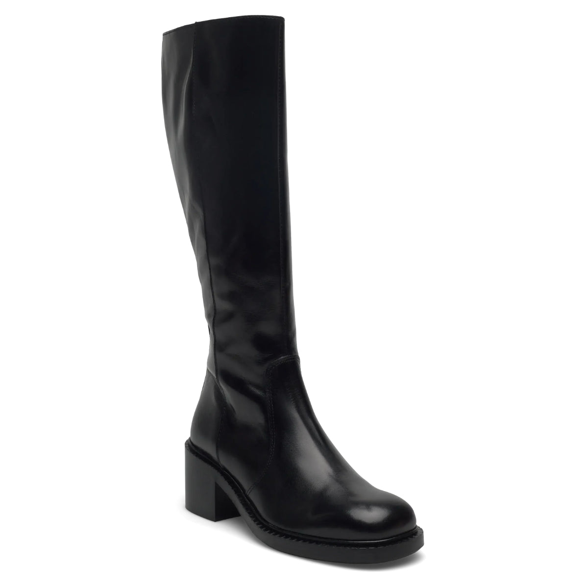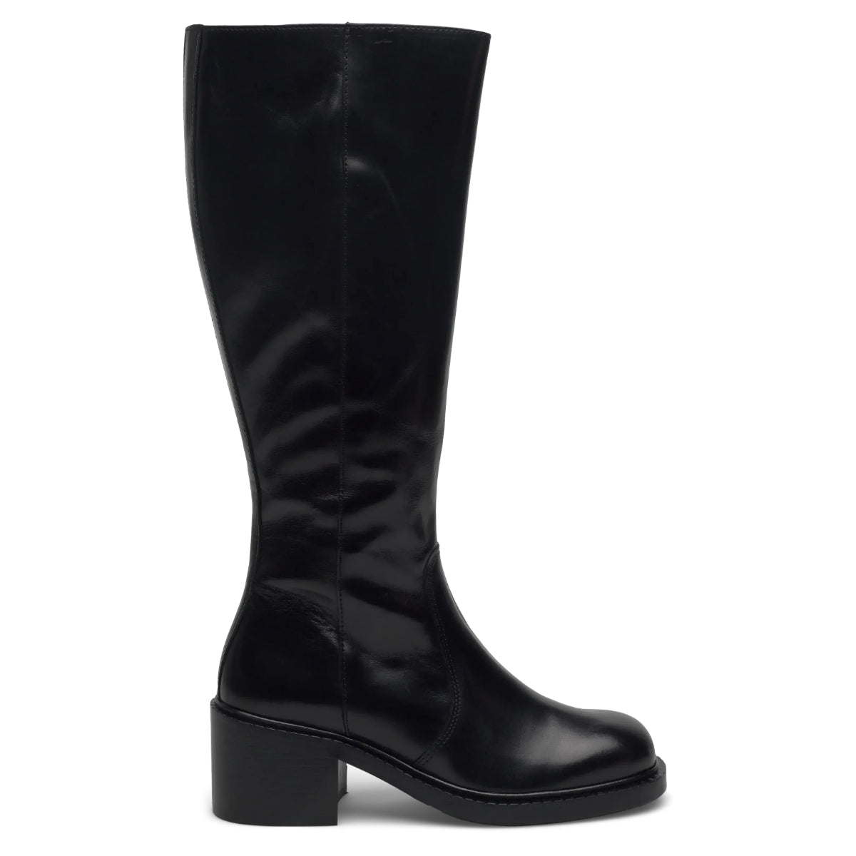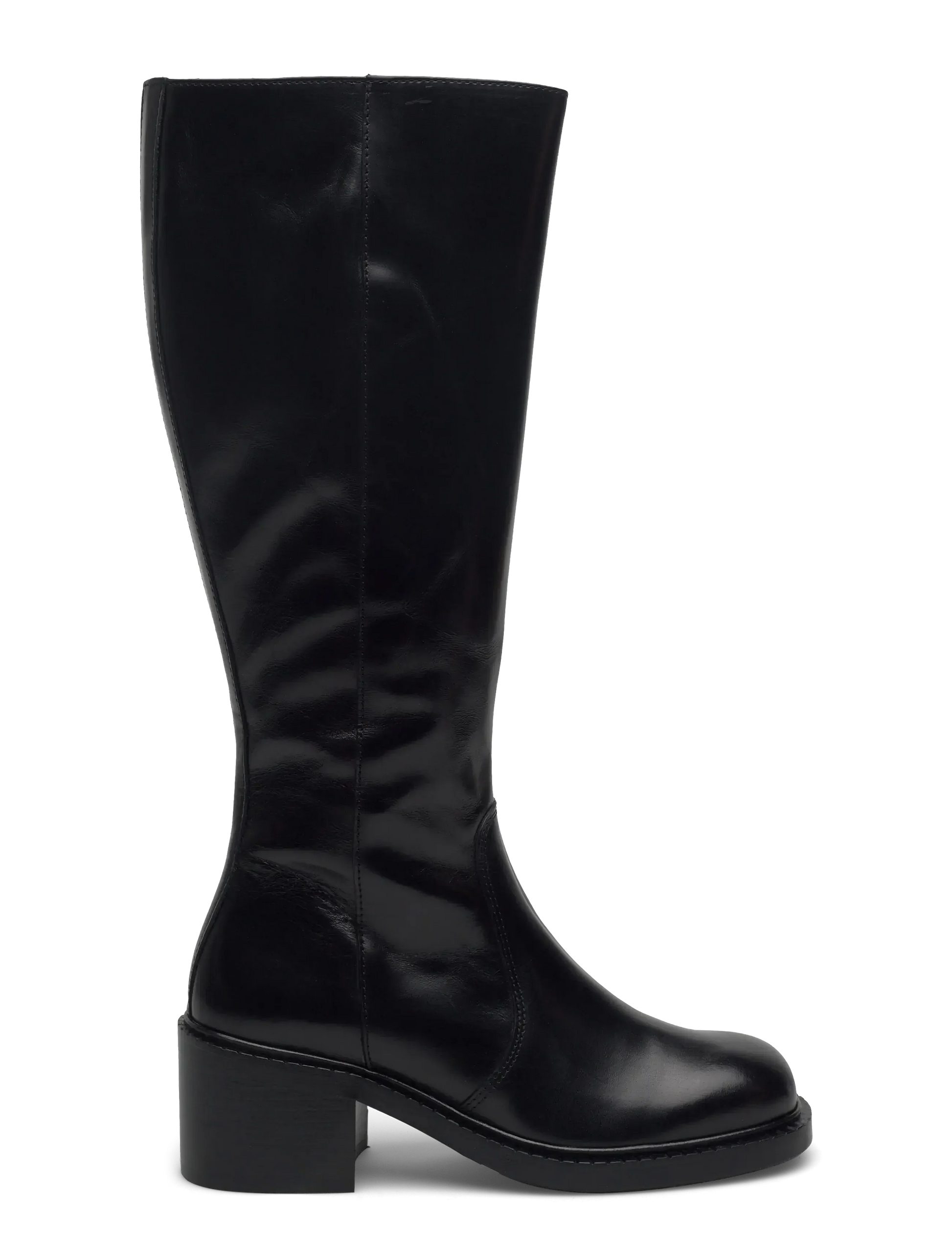 Knæhøj støvle med blokhæl og rund tå i et elegant håndlavet design. Diskrete syninger og klassisk silhuet gør den perfekt til både hverdag og fest.
