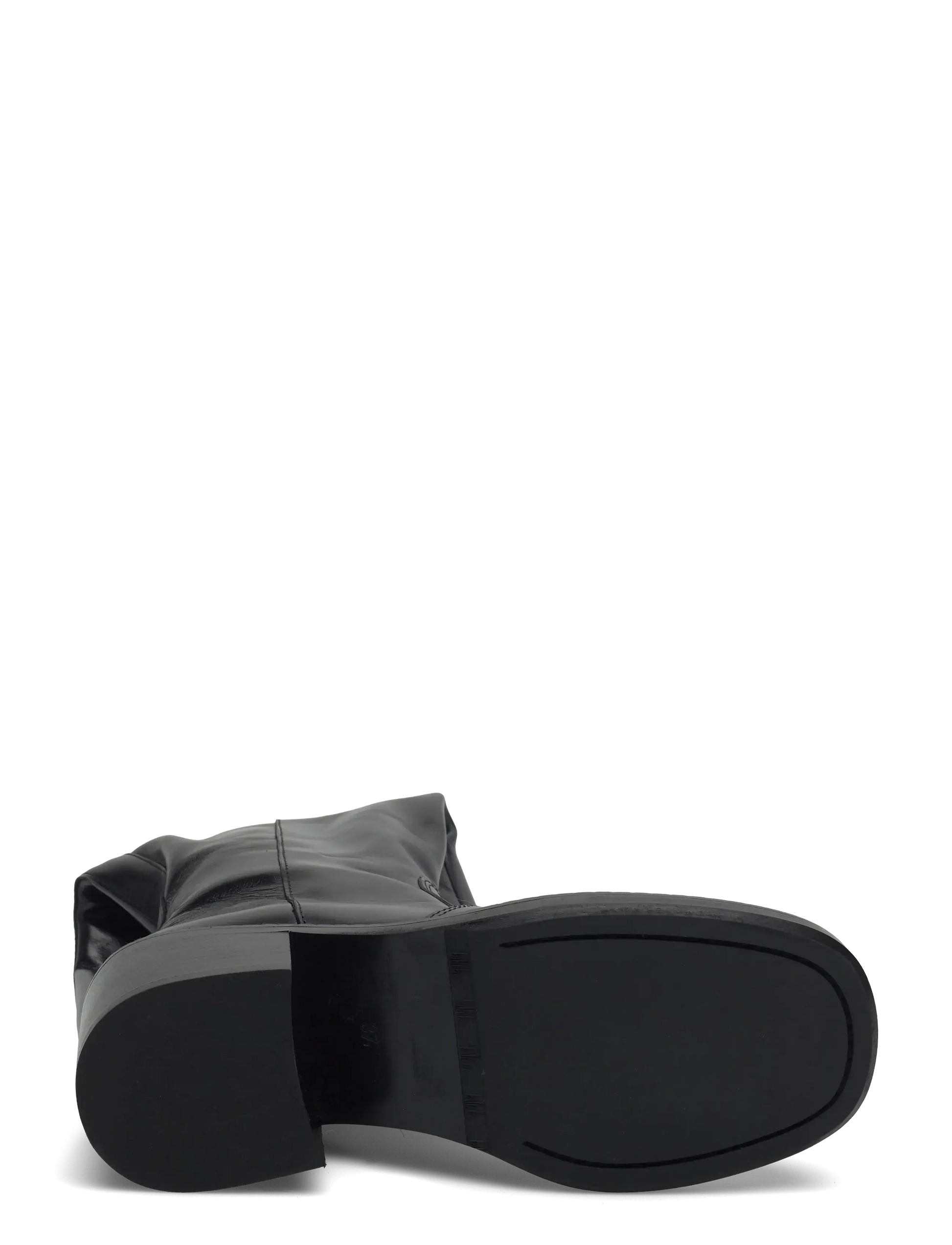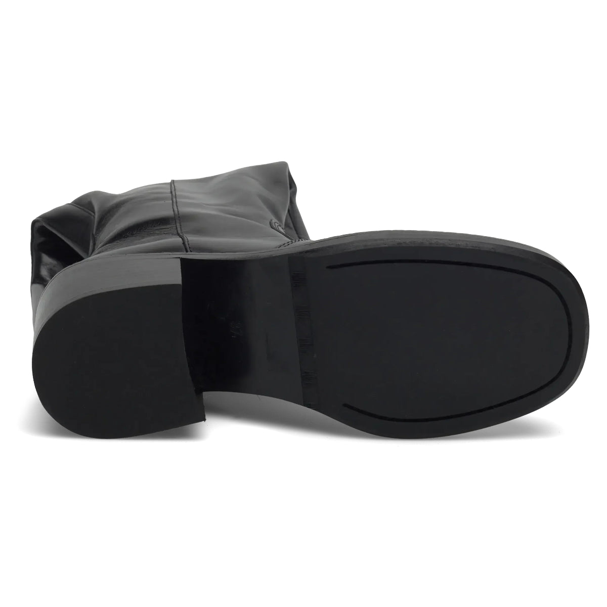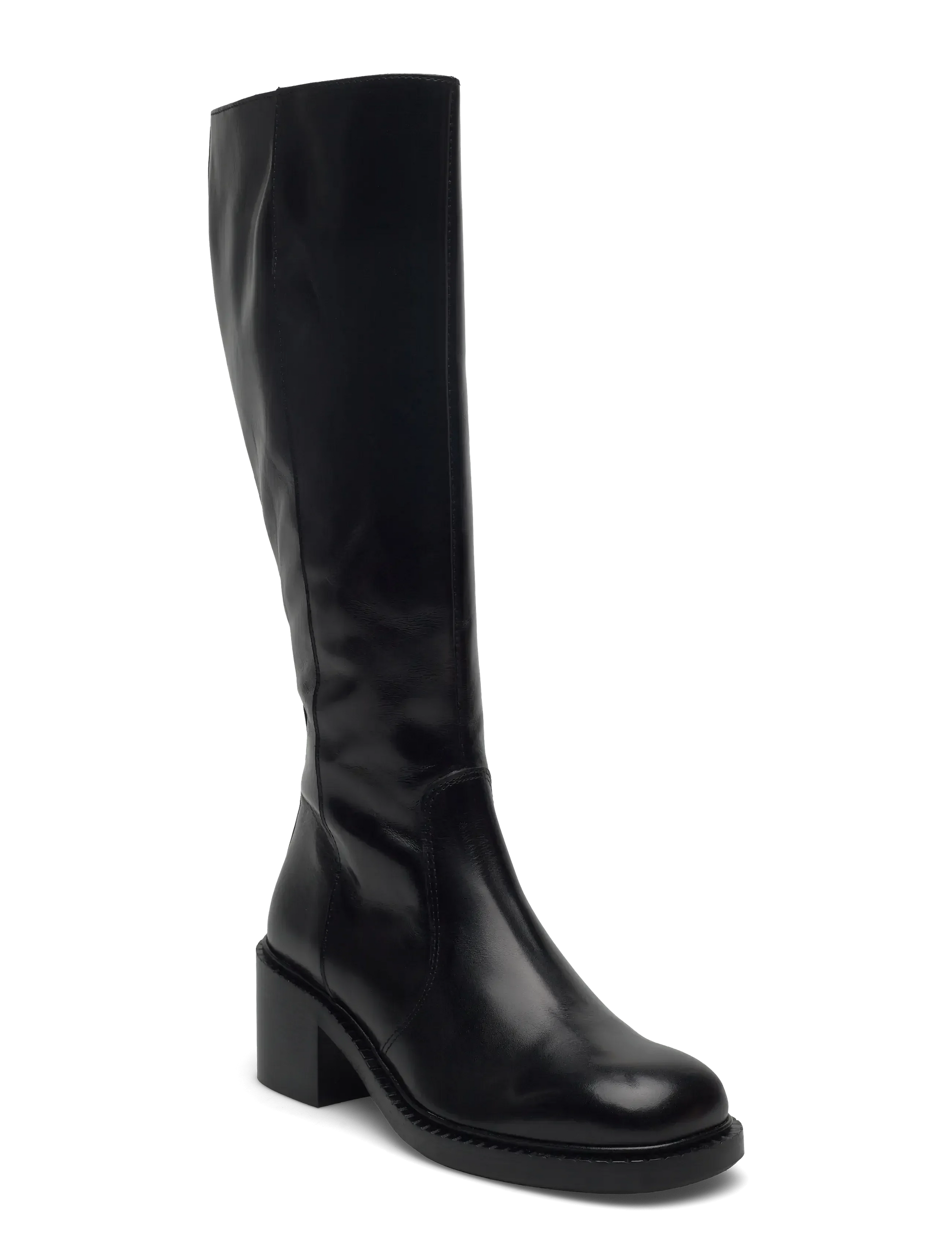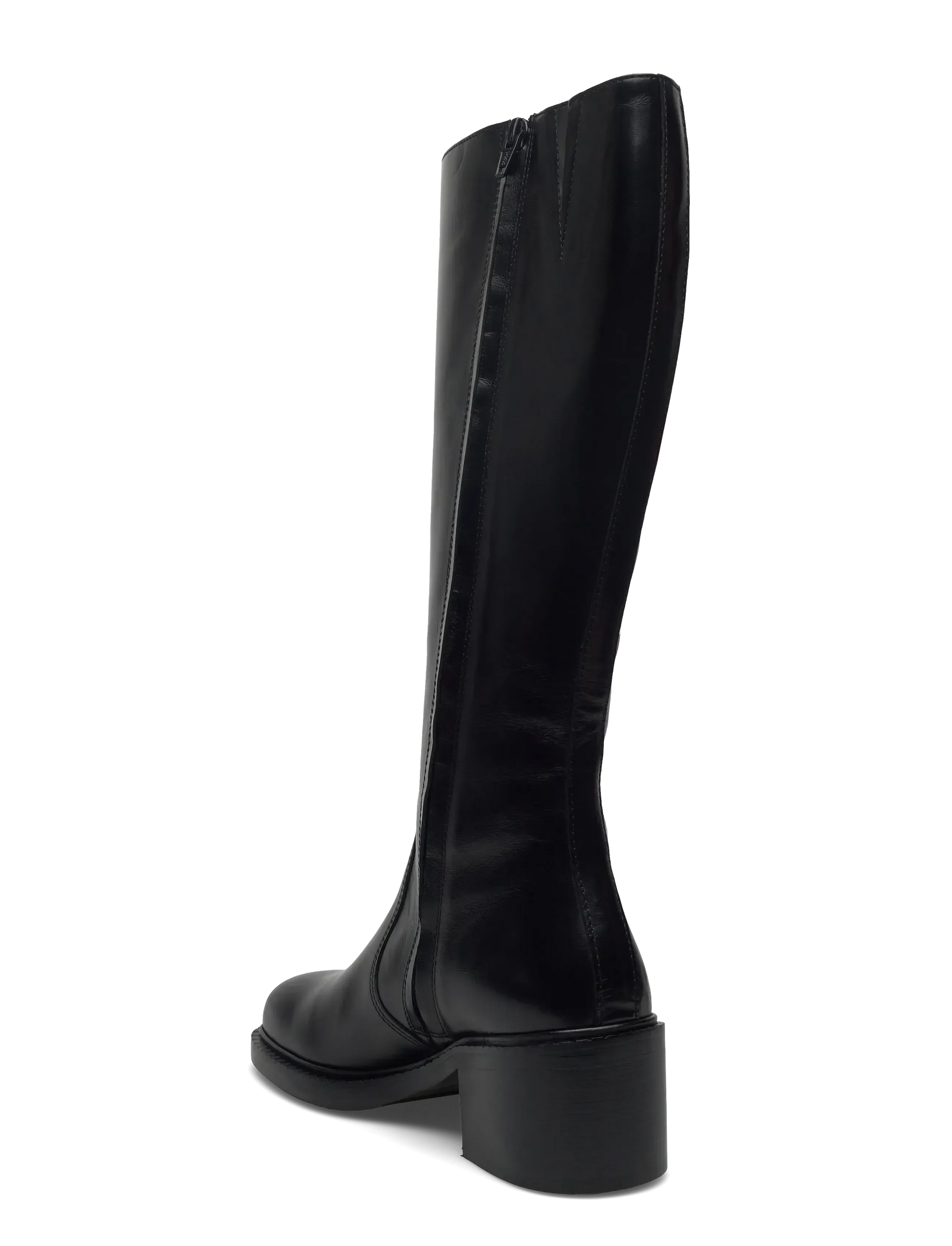 Knæhøj støvle med blokhæl og rund tå i et elegant håndlavet design. Diskrete syninger og klassisk silhuet gør den perfekt til både hverdag og fest.