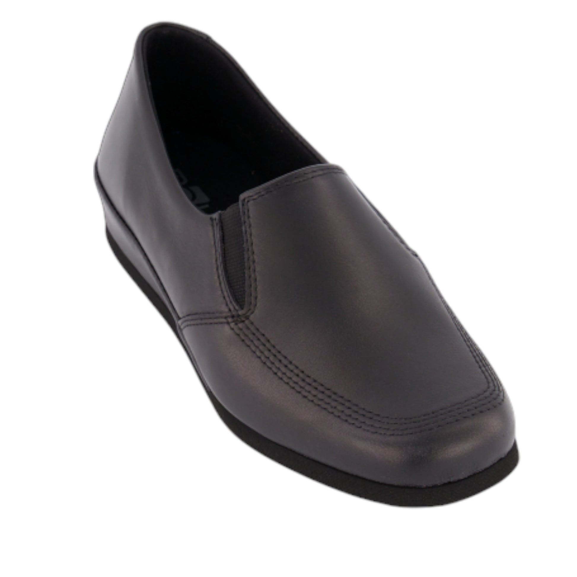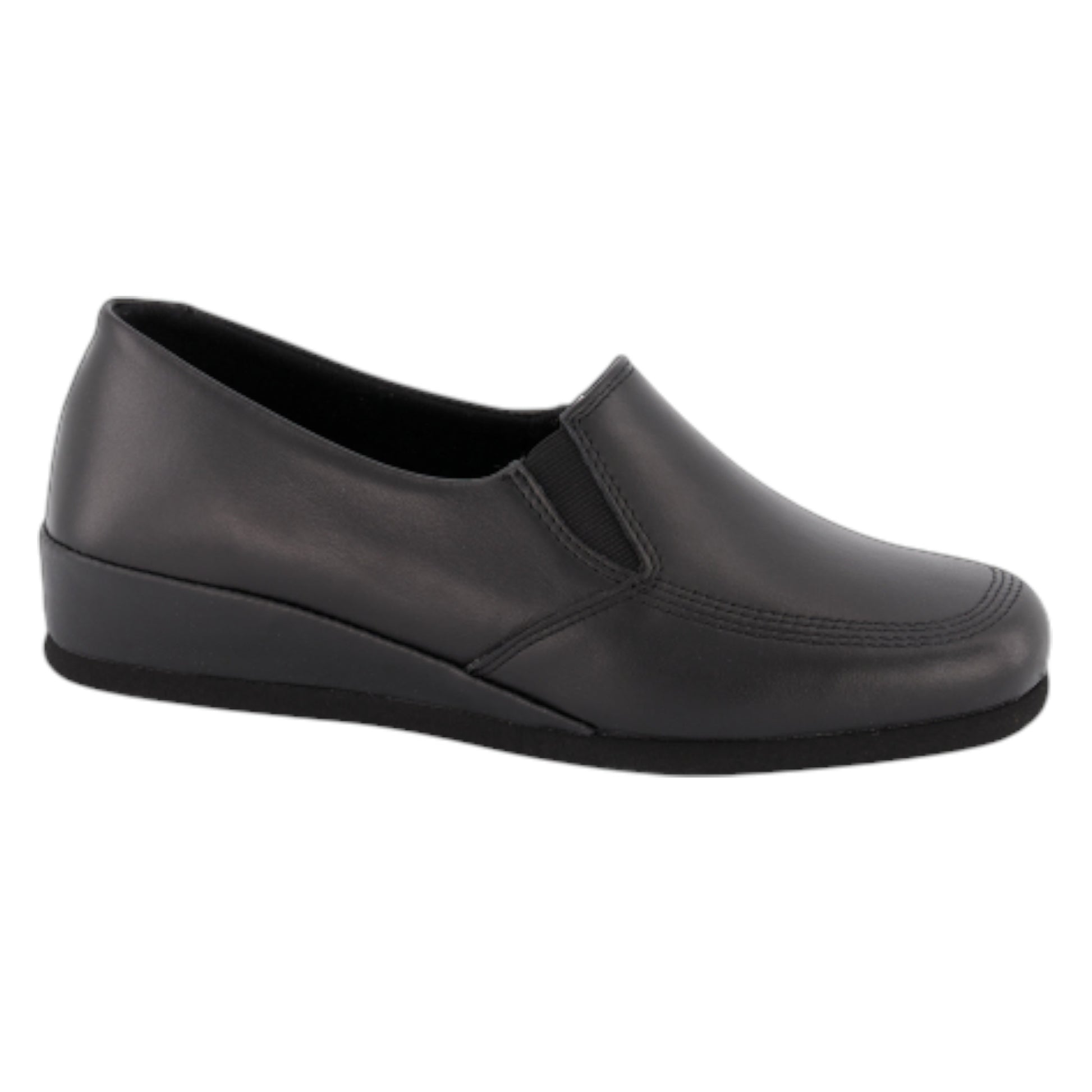 Lukket hjemmesko i elegant skind med en lille kilehæl på 30 mm. Elastik på begge sider gør den nem at tage på og sikrer en behagelig pasform, selv for høj vrist. Denne skønne sko kombinerer komfort med klassisk design, perfekt til både hjemmebrug og afslappede stunder.