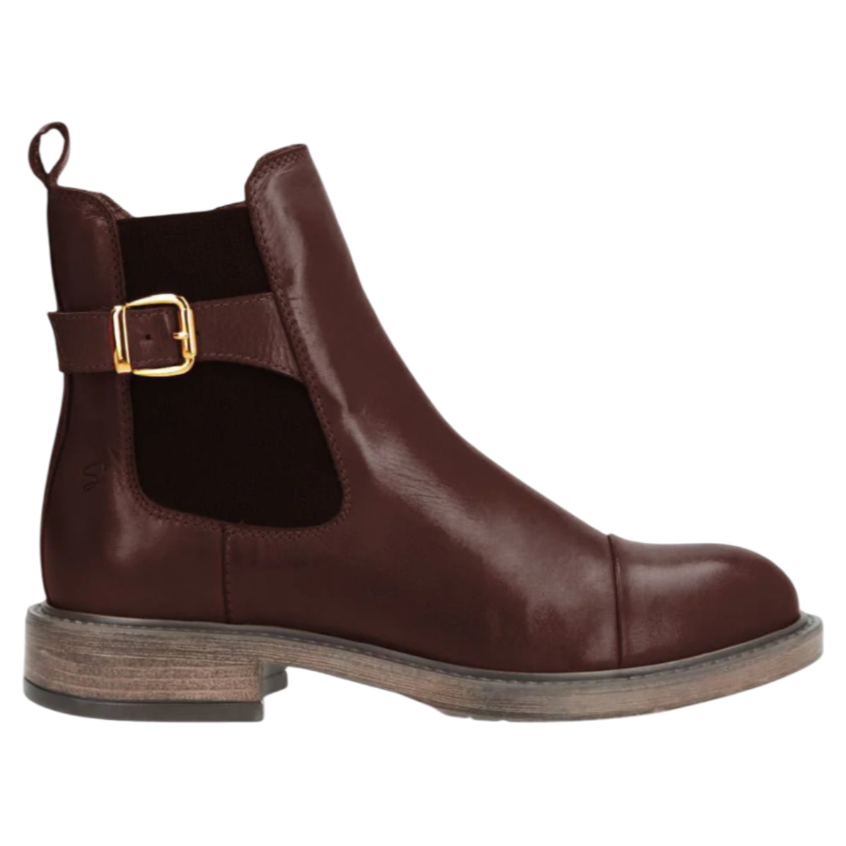 BEATRICE fra Shoedesign Copenhagen forener klassisk elegance med moderne detaljer. Fremstillet i blødt, mørkebrunt læder (ebony), giver den et varmt og eksklusivt udtryk. Den ikoniske chelsea-silhuet fuldendes af et gyldent spænde og elastikpaneler, der tilføjer både fleksibilitet og et feminint touch.