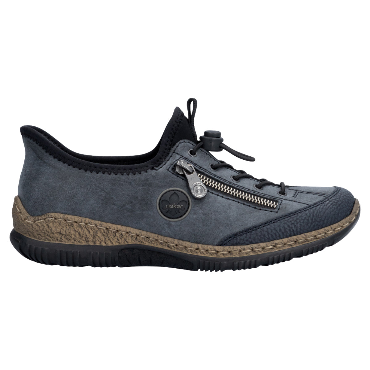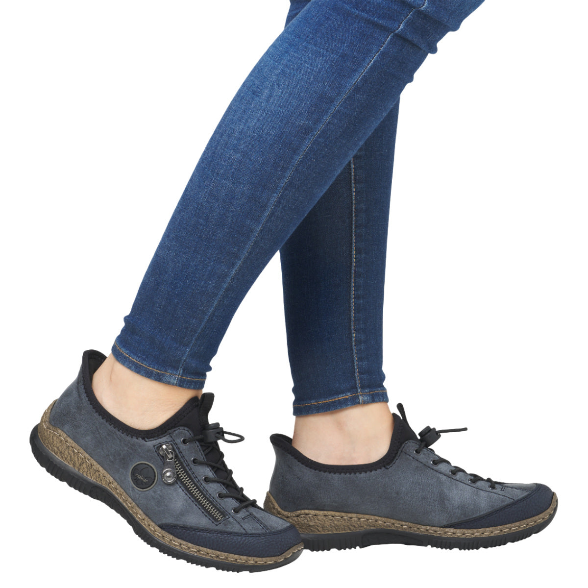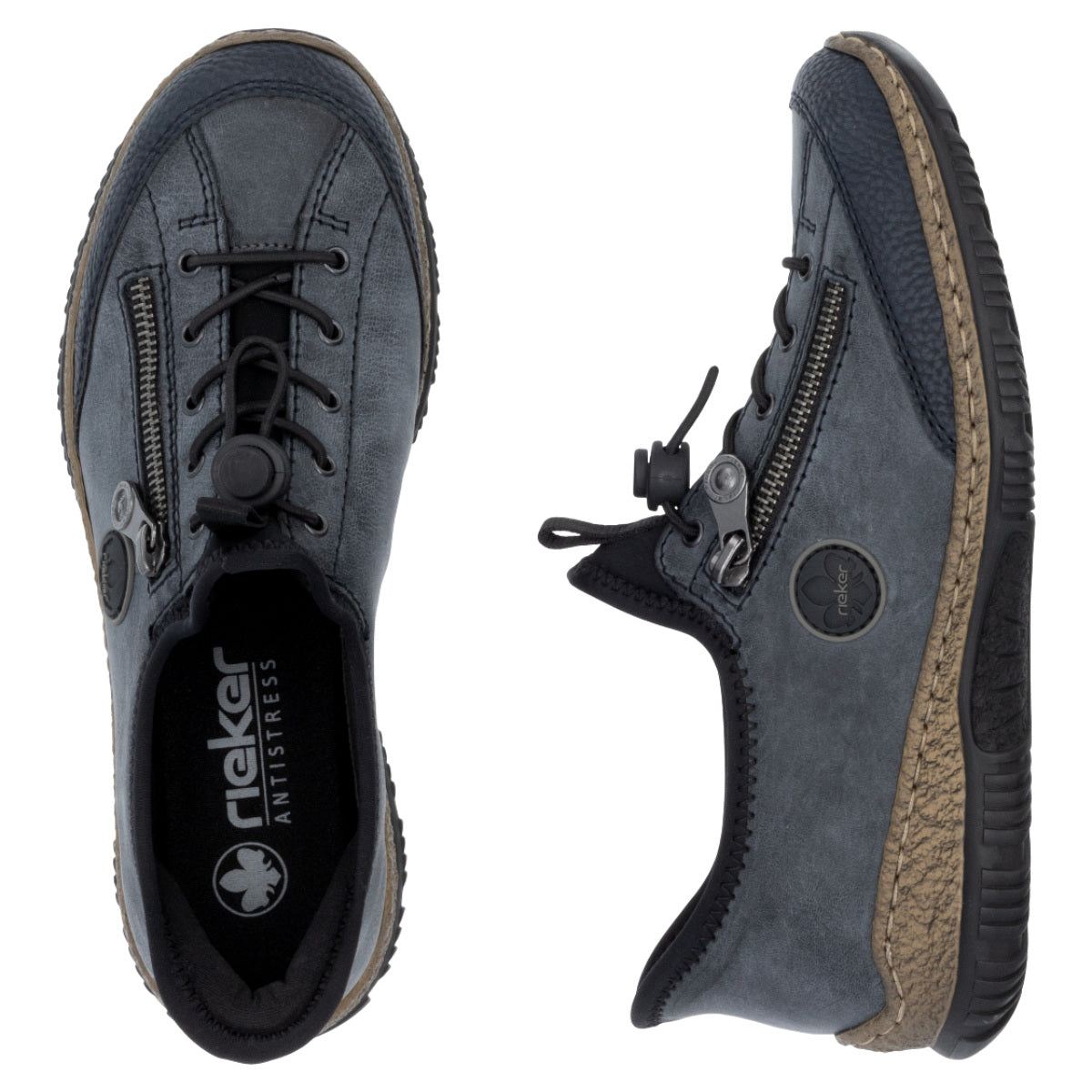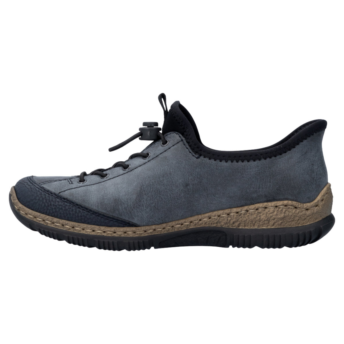 Rieker Ready 2 Go sneakers til dame i blågrå med Hands Free-teknologi, der gør det nemt at tage skoen på uden hænder. Med Rieker Antistress-komfort, elastisk åbning og snørelse får du fleksibilitet, stødabsorbering og perfekt pasform hele dagen.
