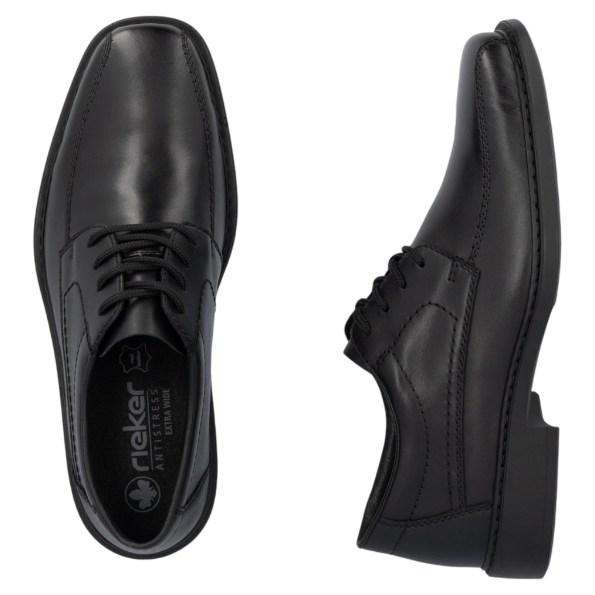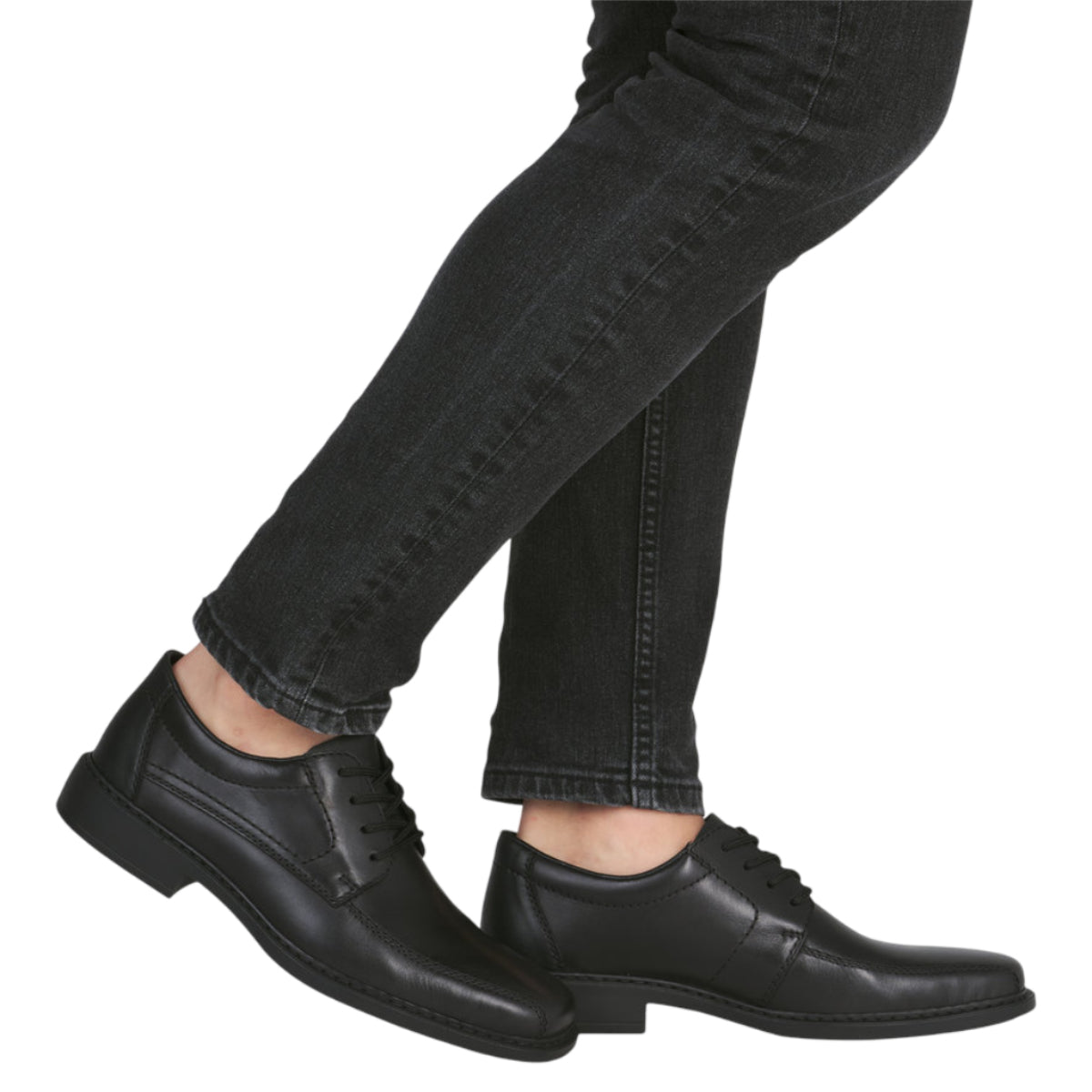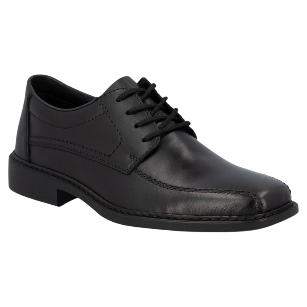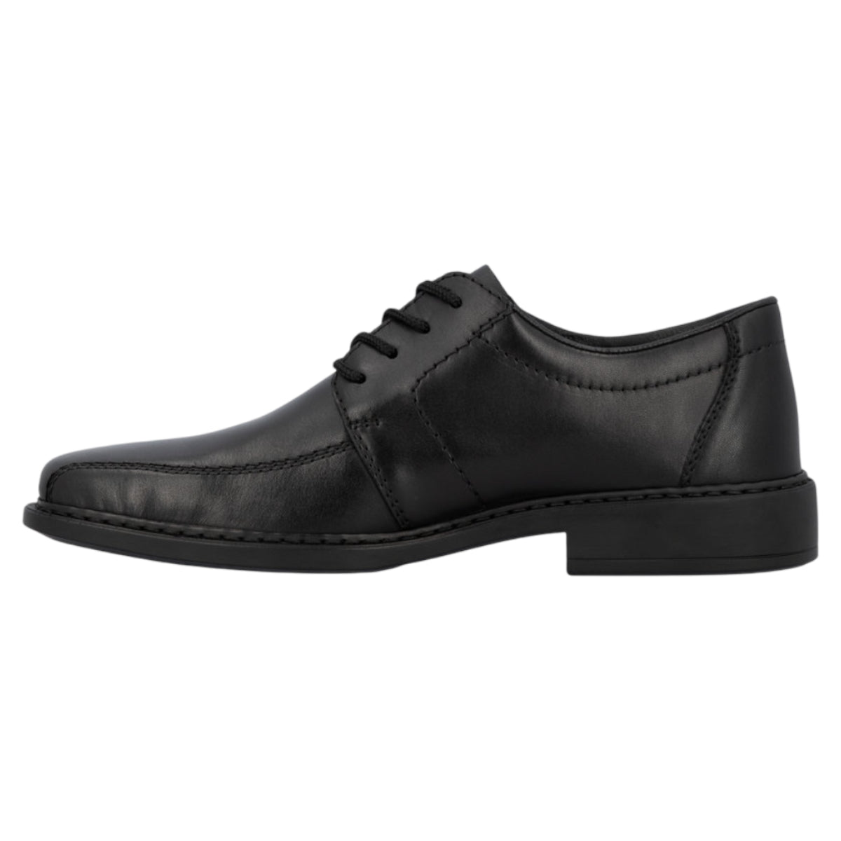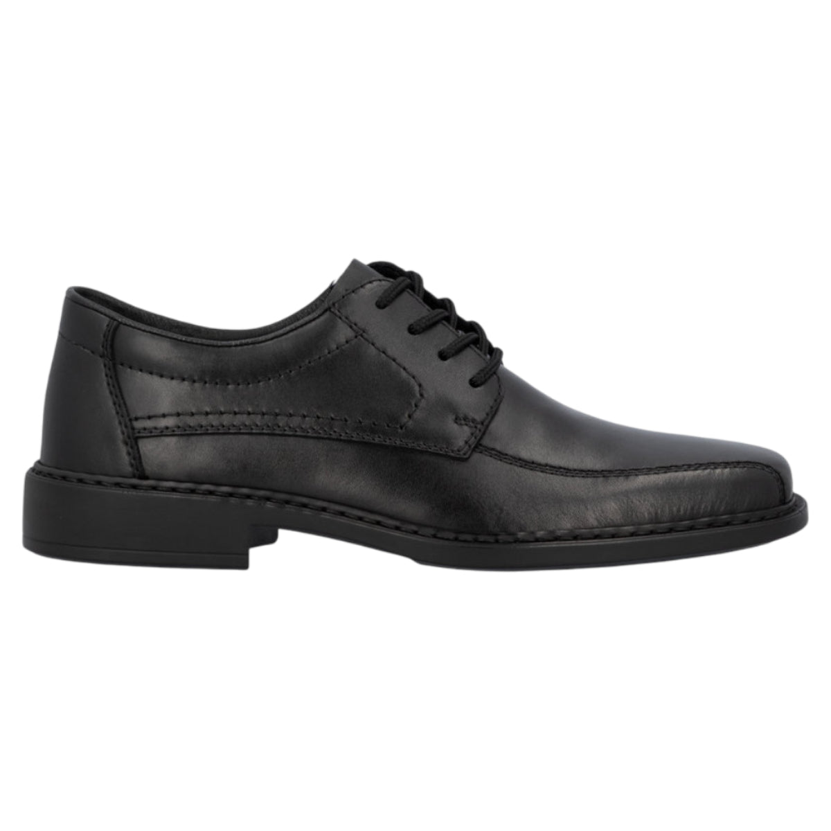 Klassisk sort snøresko fra Rieker i blødt skind med flotte syninger og let firkantet snude. Den bløde skinddæksål og fleksible ydersål giver høj komfort og en behagelig pasform hele dagen.