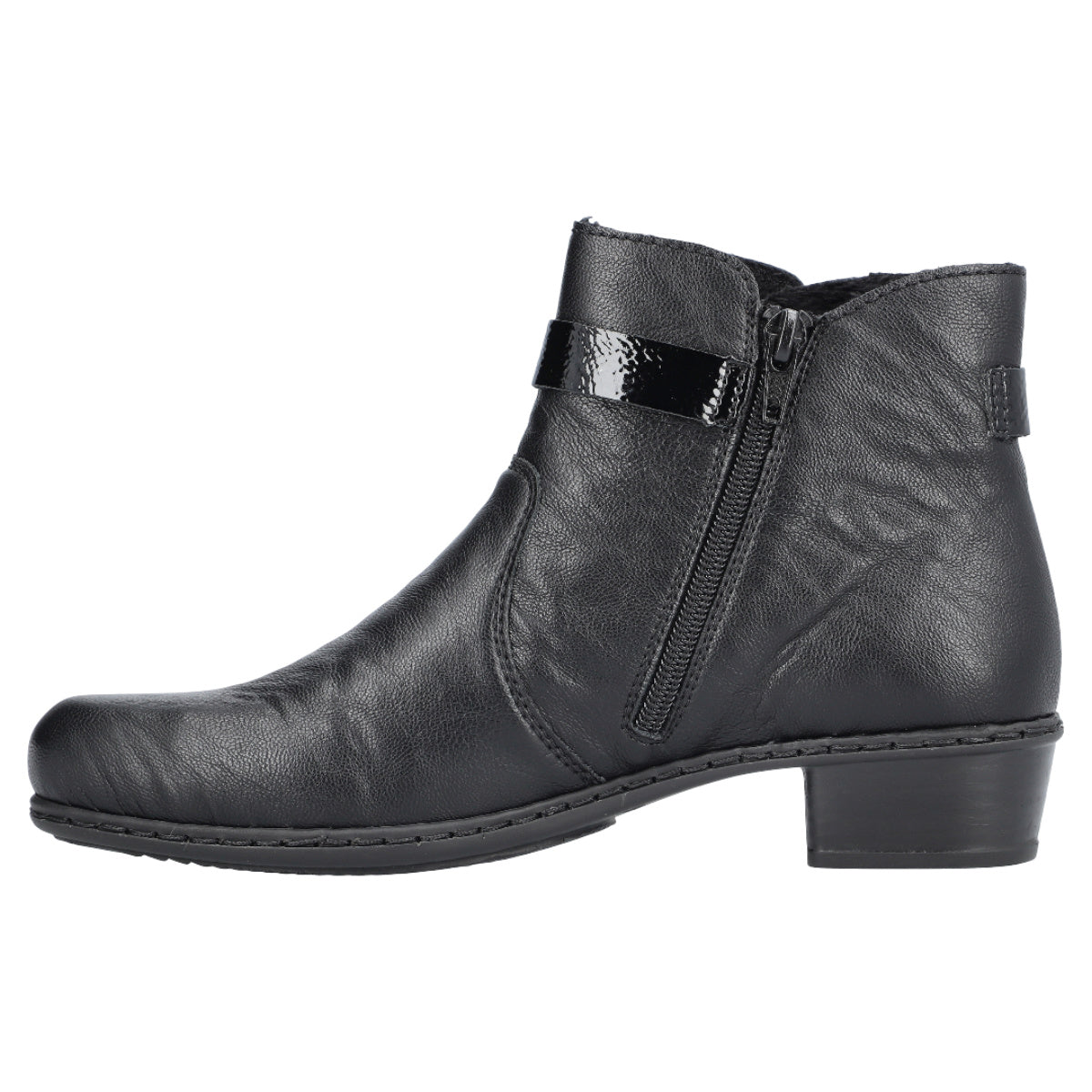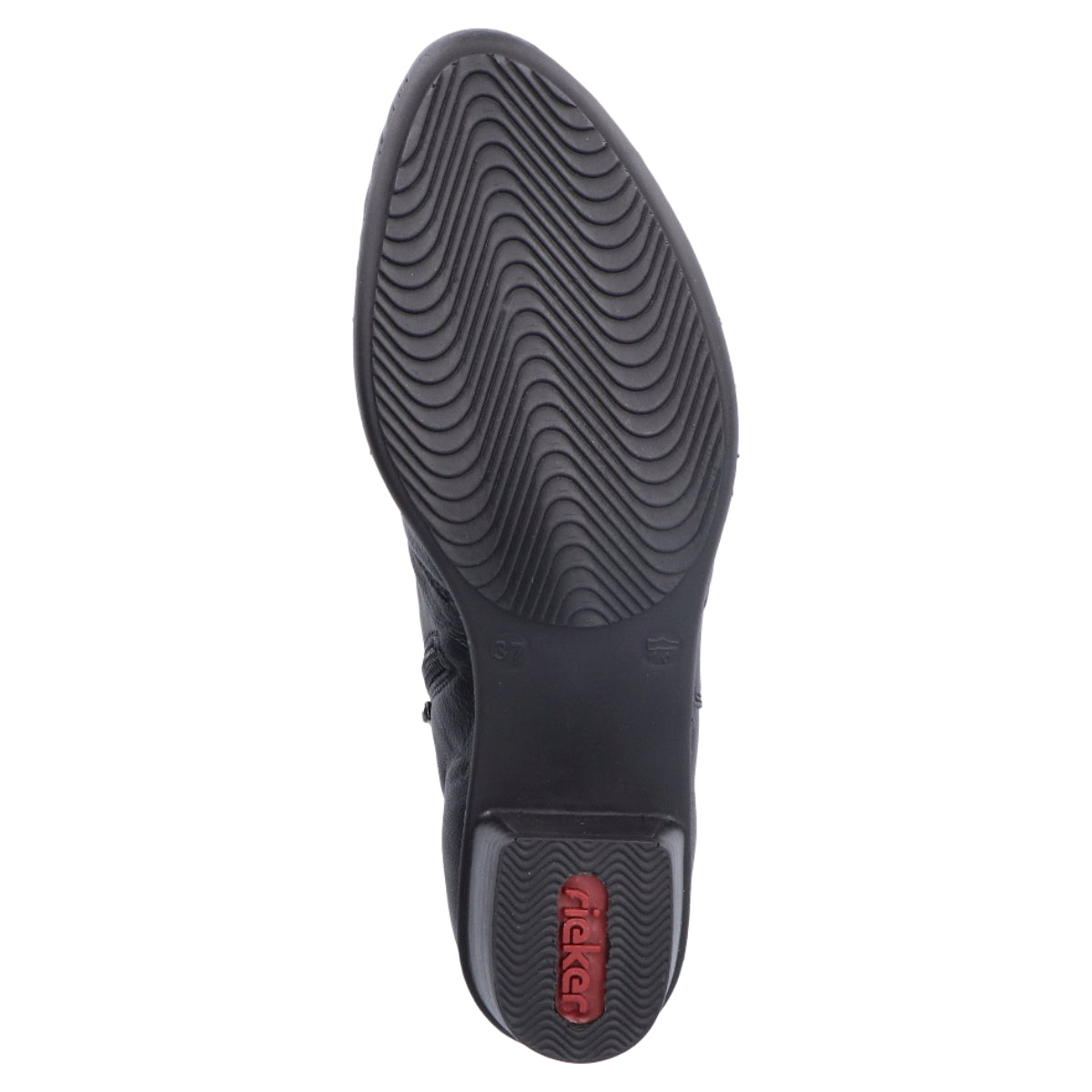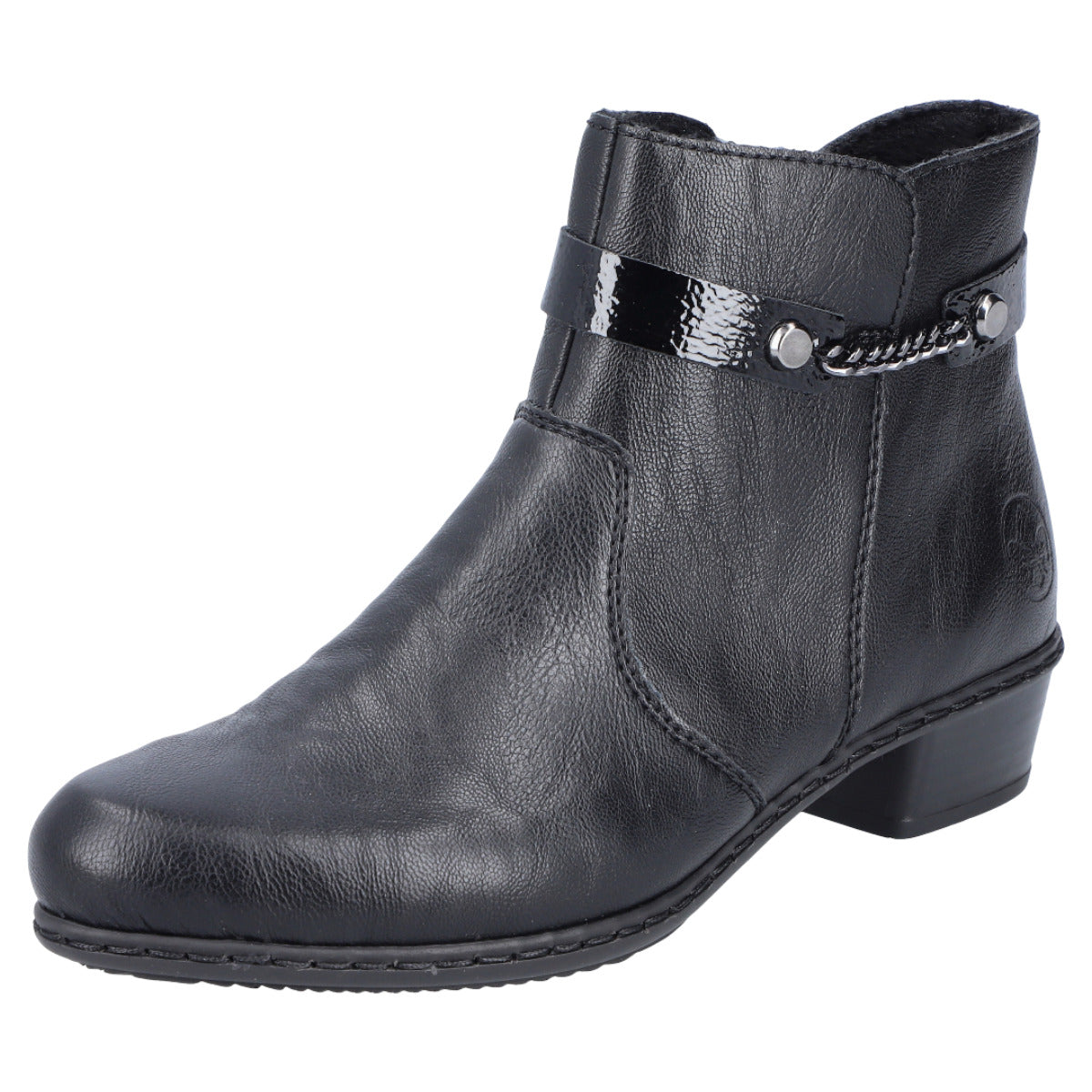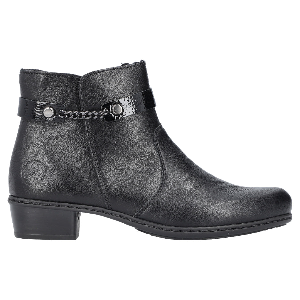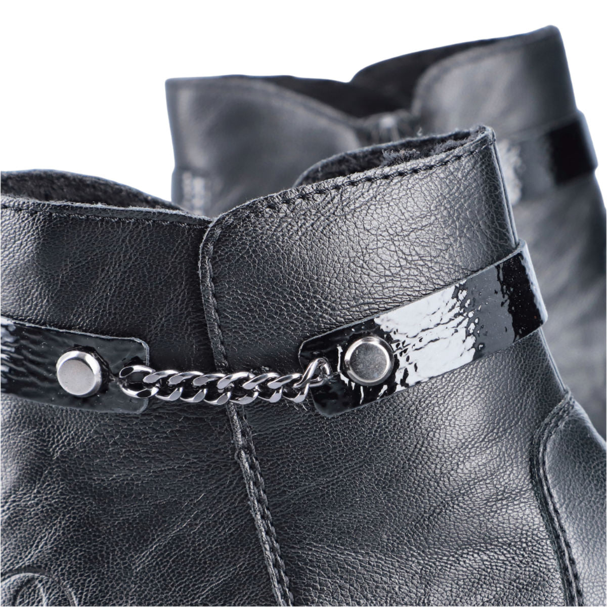 Rieker støvle i sort til dame. Disse støvletter er den perfekte kombination af komfort og stil. Med lynlåsen kan du nemt og hurtigt tage dem på, mens den dekorative sølvkæde på siden tilføjer et moderne touch. Den lette og støddæmpende sål med ca. 3 cm. blokhæl sikrer uovertruffen komfort, selv på de længste dage. Oplev en moderne wellness-oplevelse i ægte Rieker-stil! Denne elegante letvægtsstøvle i en sofistikeret sort nuance er prydet med smukke detaljer på siden. Med blød, fleksibel konstruktion og let foring, tilbyder den ekstra komfort til dine fødder hele dagen.