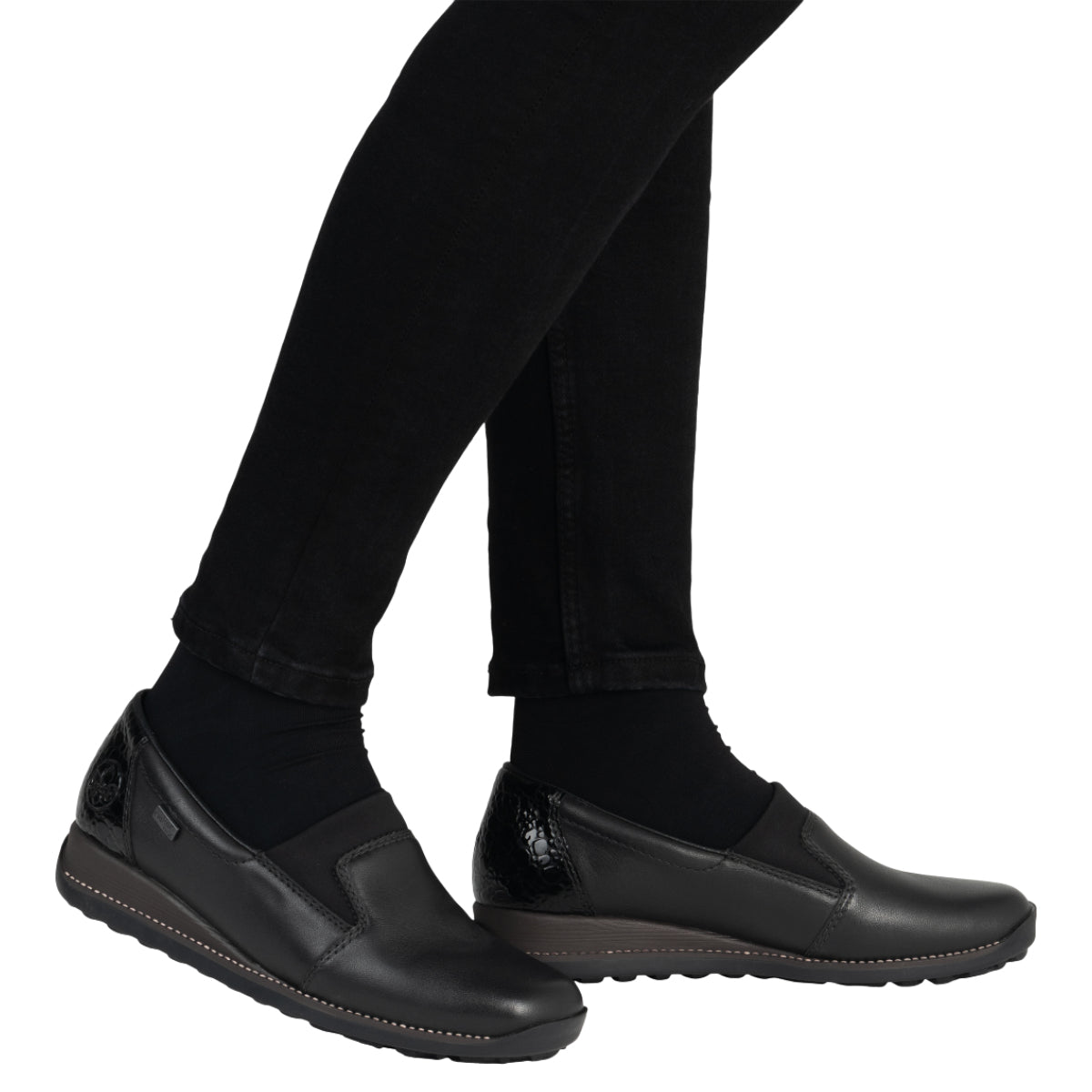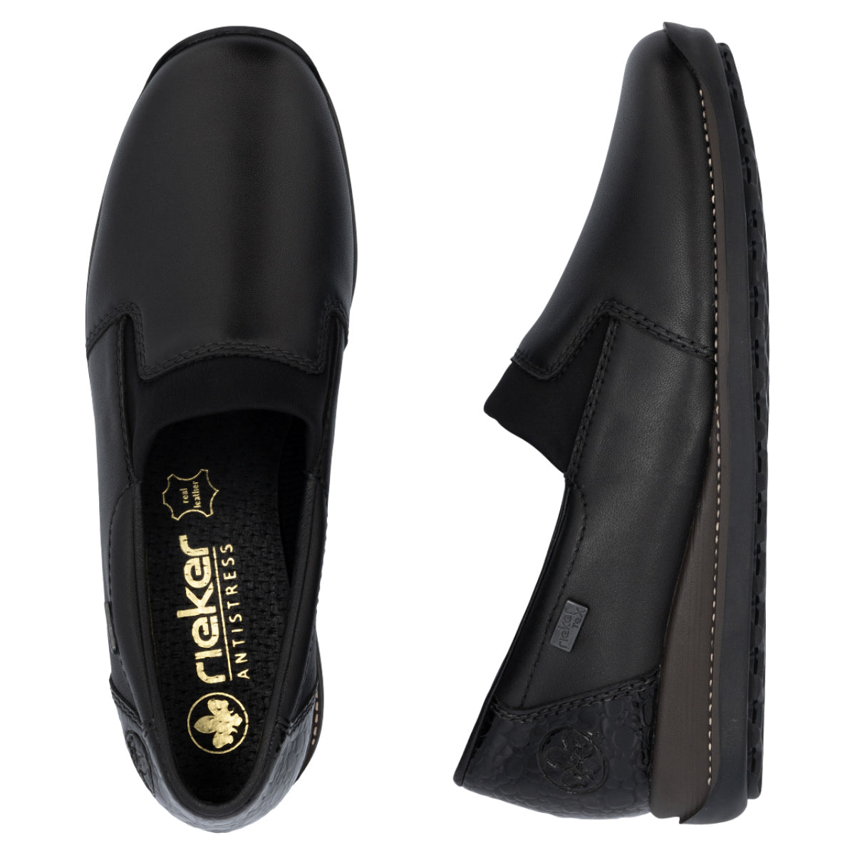 Klassiske Rieker sko til dame i sort i blødt skind med moderne detaljer. Elastisk åbning sikrer nem påtagning og fleksibel pasform, mens blød skindindersål, stødabsorberende ydersål og Rieker-TEX holder fødderne komfortable, stabile og tørre hele dagen.