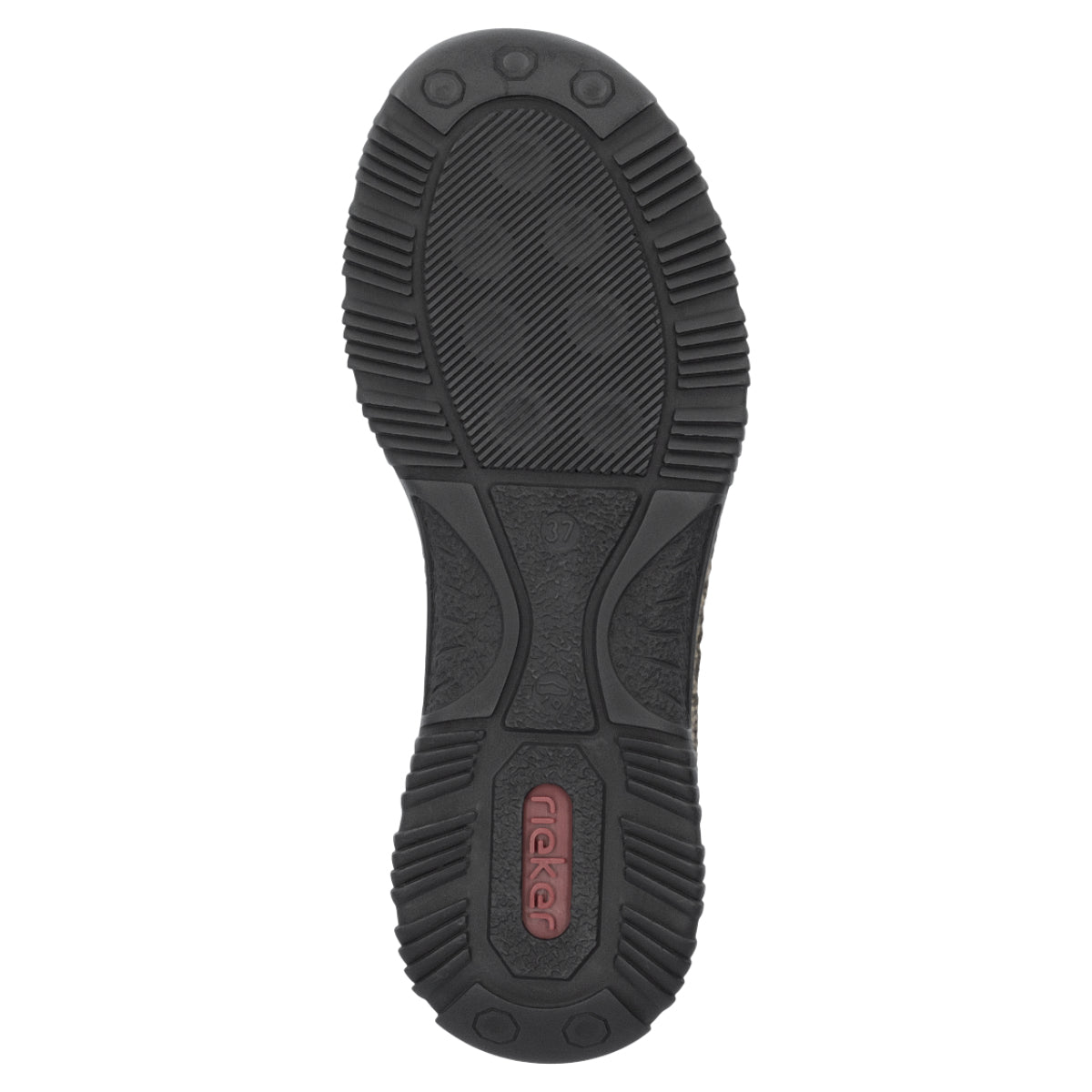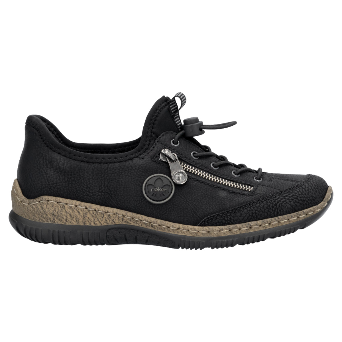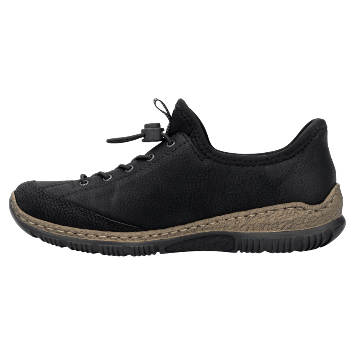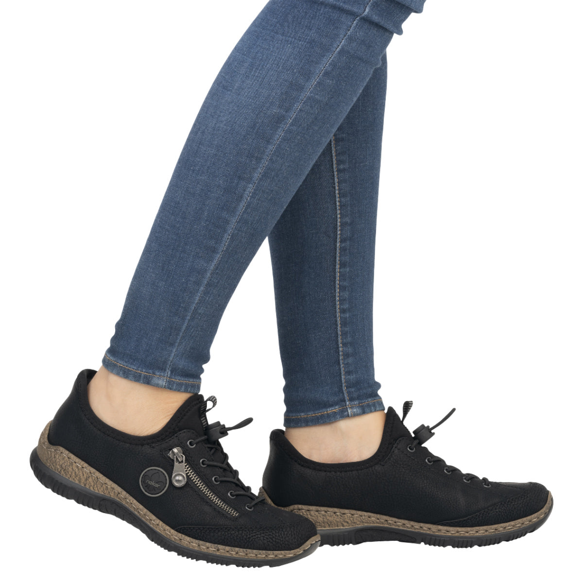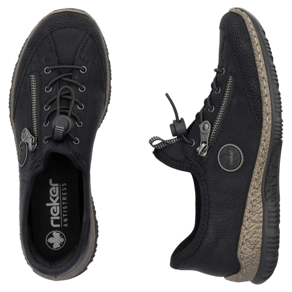 Rieker Ready 2 Go sneakers til dame i sort med Hands Free-teknologi, der gør det nemt at tage skoen på uden brug af hænder. Den lette, stødabsorberende sål og bløde Memosoft-indersål sikrer komfort hele dagen, mens dekorativ lynlås og bløde materialer giver stilfuldt udtryk.