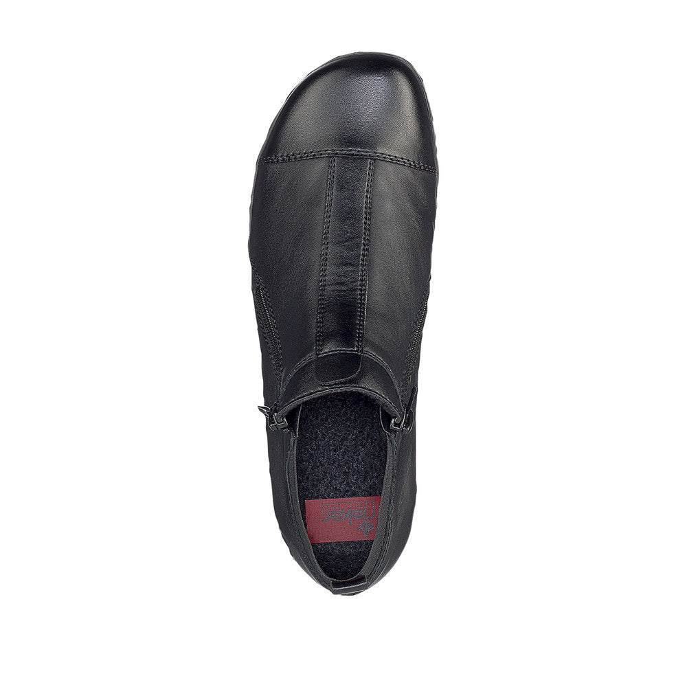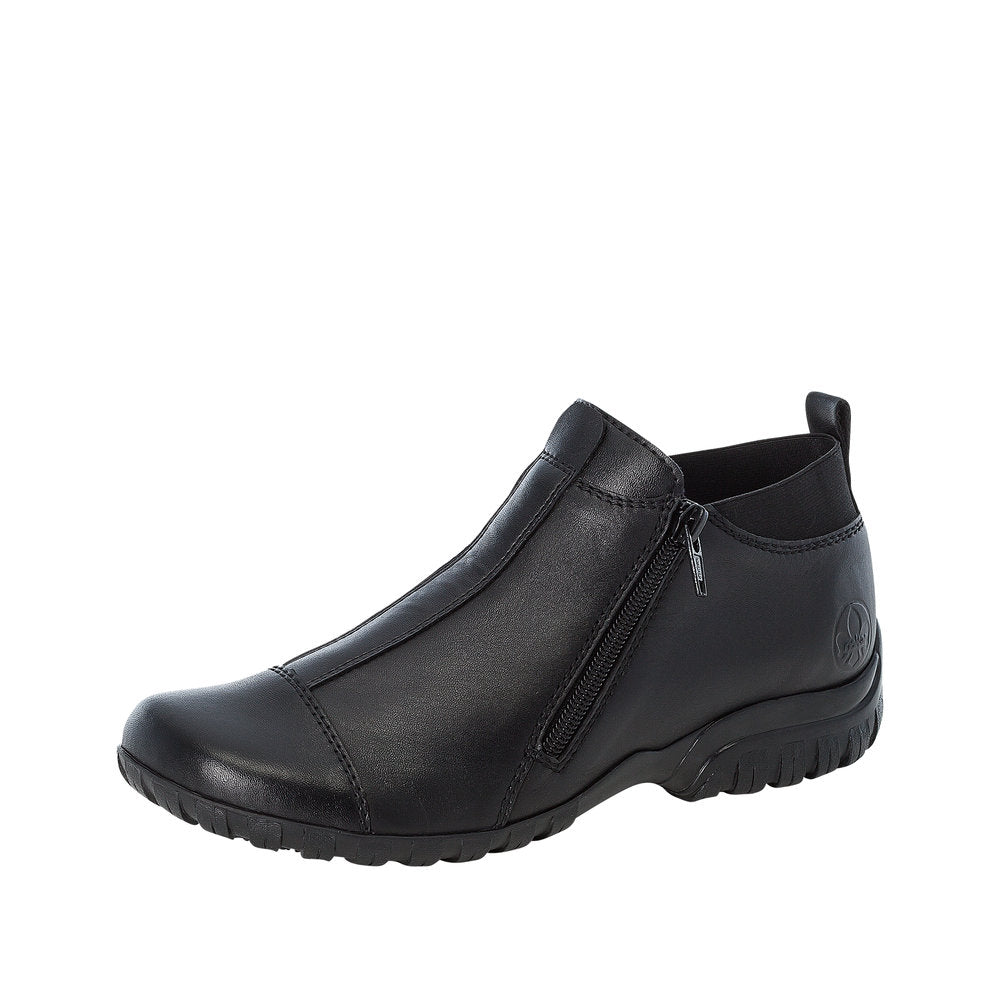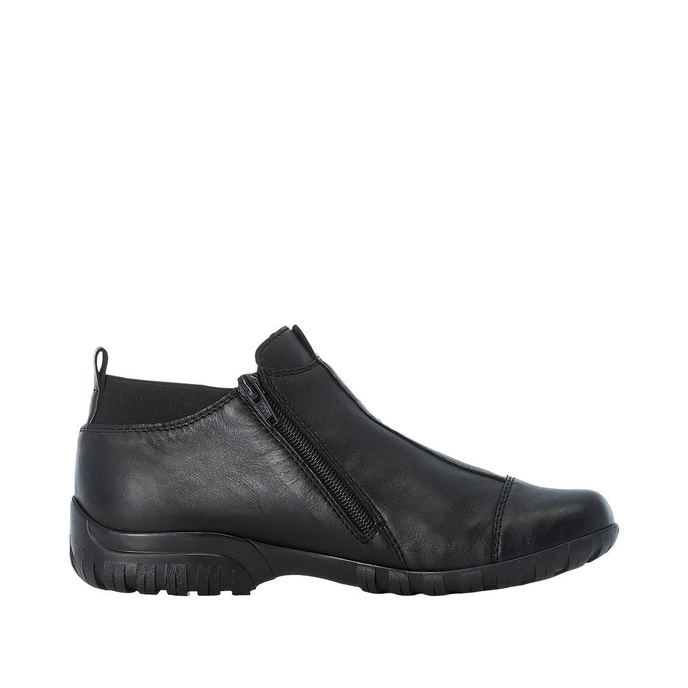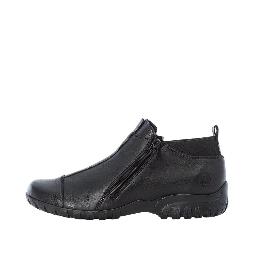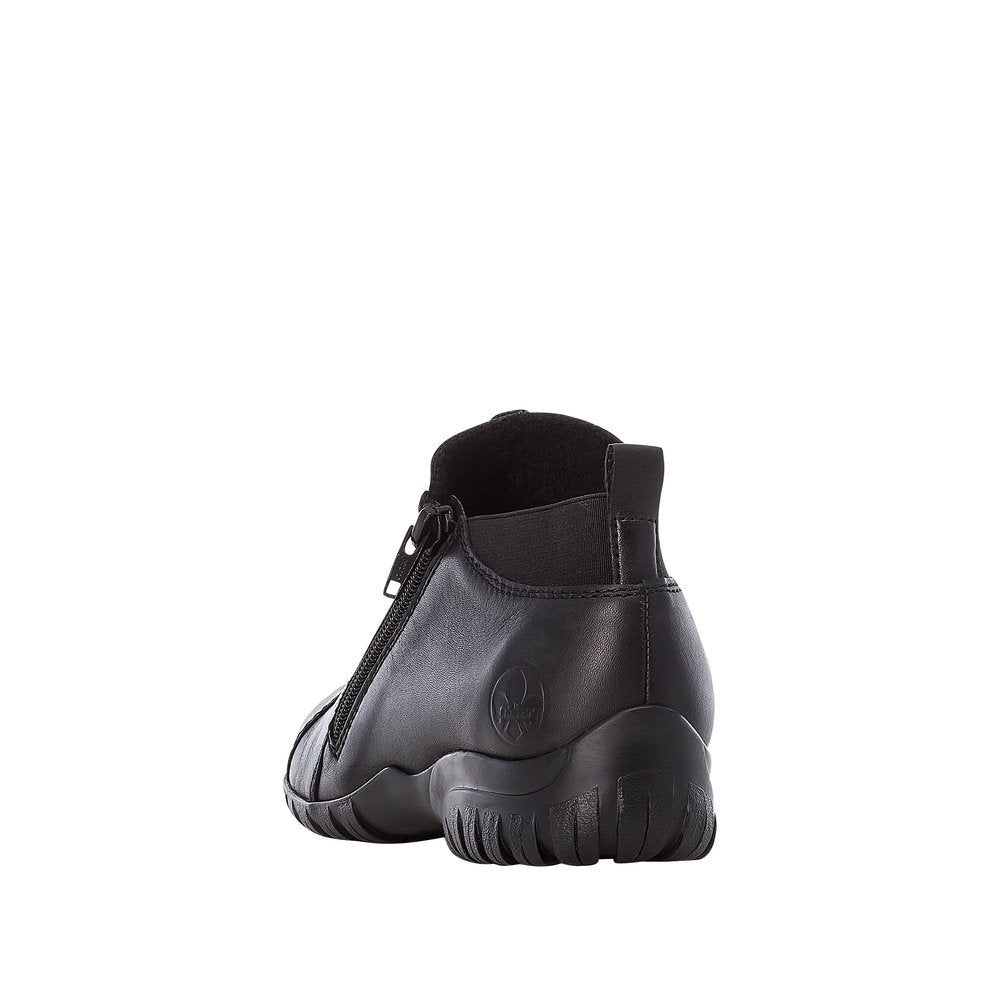 Elegant og praktisk støvle fra Rieker i sort, blødt skind. De flotte syninger giver et moderne look, mens de to lynlåse og elastikken bagpå gør den nem at tage af og på. Indvendigt sørger det lette foer og den bløde indersål for varme og komfort hele dagen. Den mønstrede, slidstærke ydersål giver godt fodfæste og effektiv stødabsorbering – perfekt til hverdagsbrug i de kølige måneder.