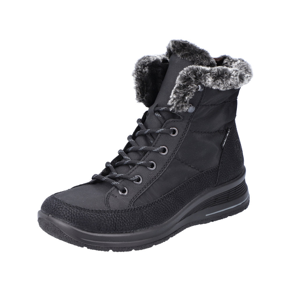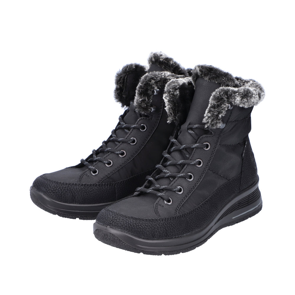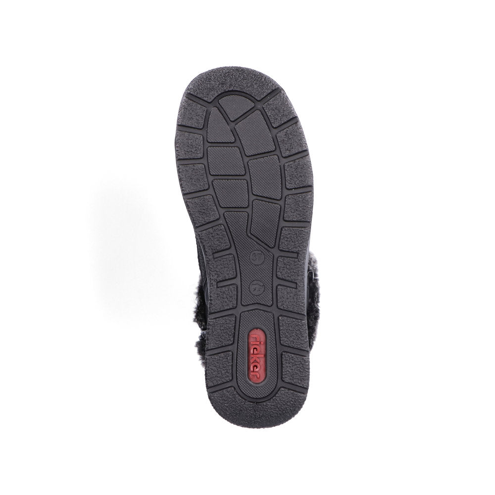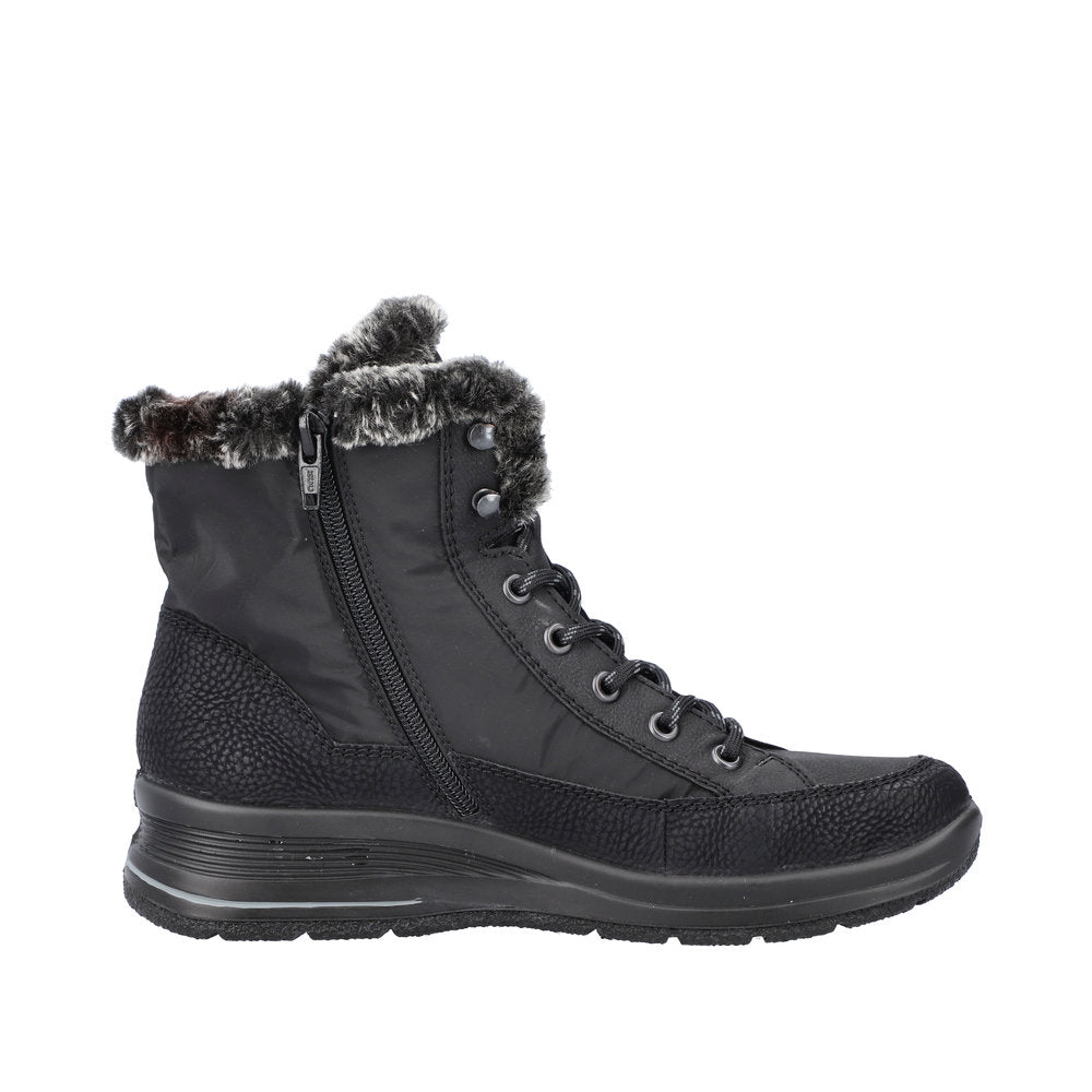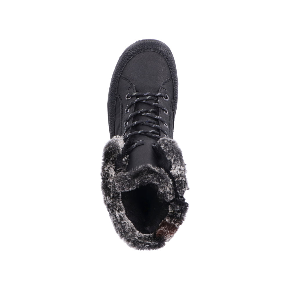 Rieker vinterstøvle i sort til dame. Stil og komfort går hånd i hånd med disse elegante nattsorte snørestøvler fra Rieker til damer. Det enkle og praktiske design omfatter både snørelukning og lynlås, hvilket sikrer en perfekt pasform og godt greb. Den pelsbeklædte skaftkant giver et ekstra elegant touch. Den lette og stødabsorberende sål sikrer vedvarende komfort, selv på lange dage. Den varme, hyggelige foring og RiekerTEX-teknologien holder dine fødder varme og tørre, så du kan sige farvel til frostvejr og kulde. En støvle, der både ser godt ud og holder dig komfortabel hele dagen!