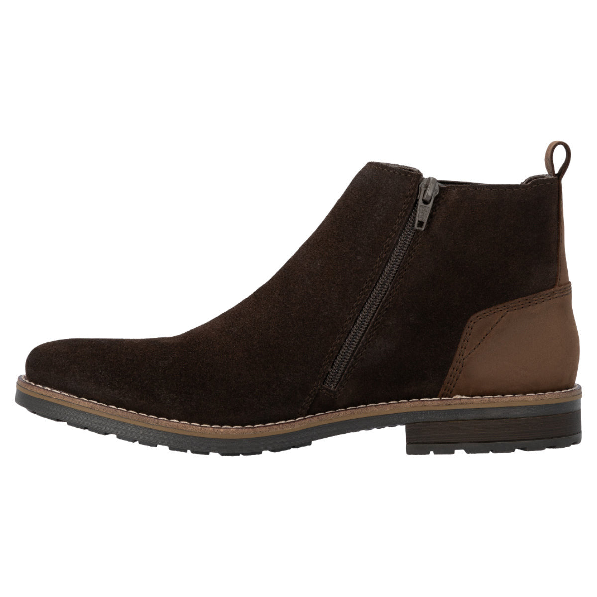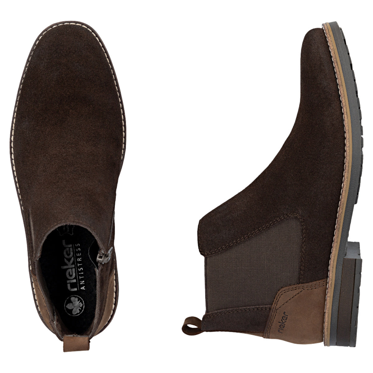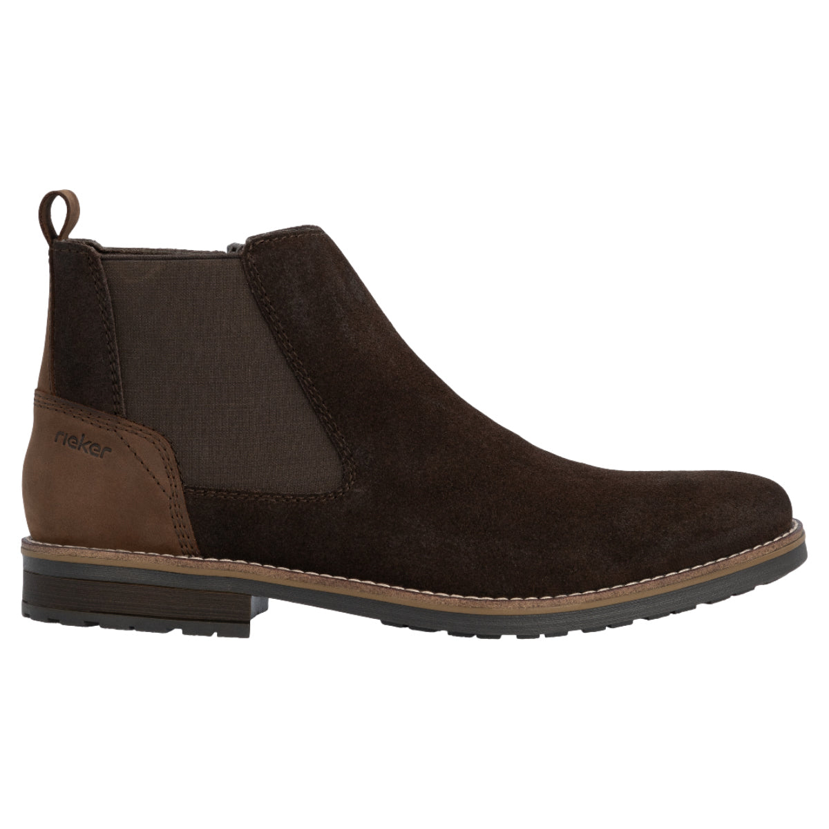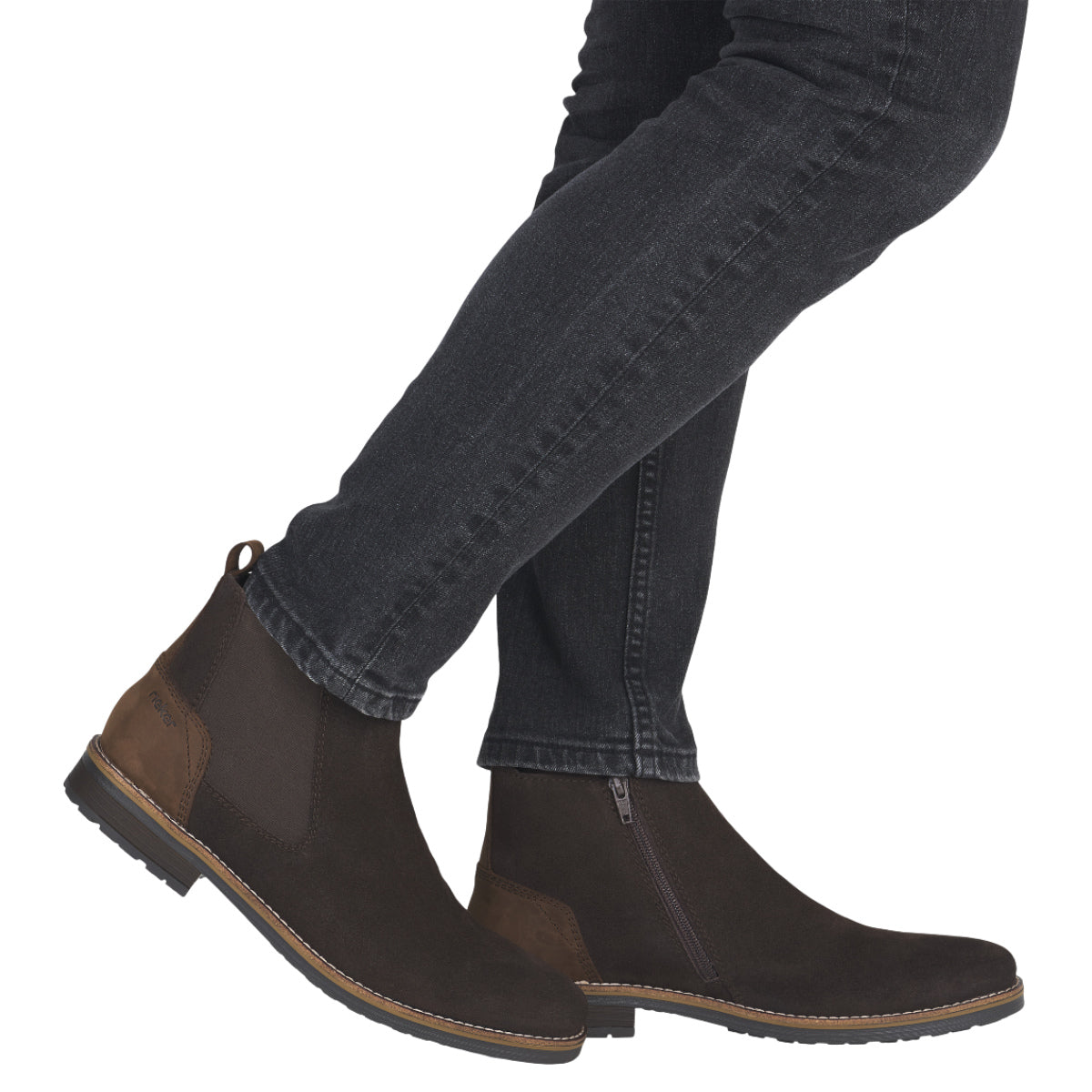 Klassiske Rieker herrestøvler i brun ruskind med moderne Chelsea-look, elastiske sider og lynlås for nem påtagning. Den bløde ruskindsoverflade giver et eksklusivt udtryk, mens den stabile ydersål og komfortable indersål sikrer støtte og komfort hele dagen.