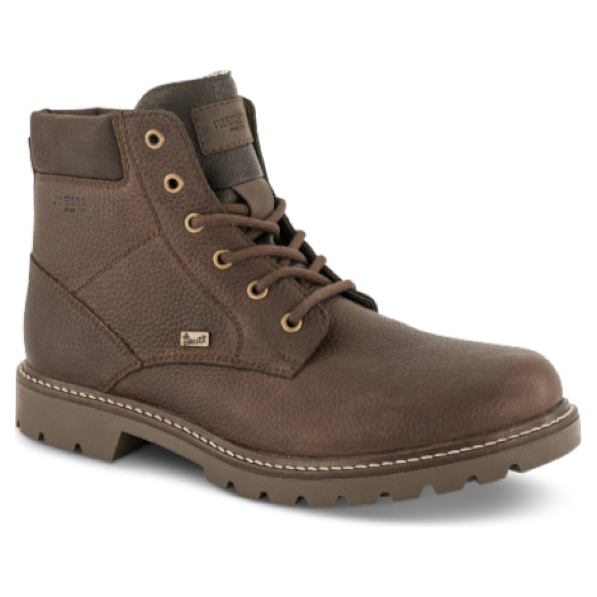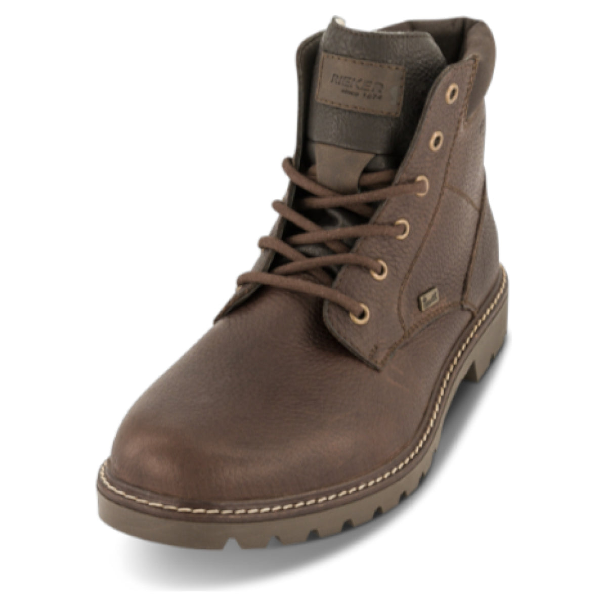 Robust Rieker vinterstøvle til herre med vandafvisende RiekerTEX, læderoverdel og varmt lammeuldsfor, der holder fødderne tørre og varme i vinterkulden. Den bløde indersål, regulerbare snørebånd og lynlås sikrer optimal komfort og pasform, mens den profilerede TPR-ydersål giver sikkert fodfæste på alle underlag.